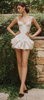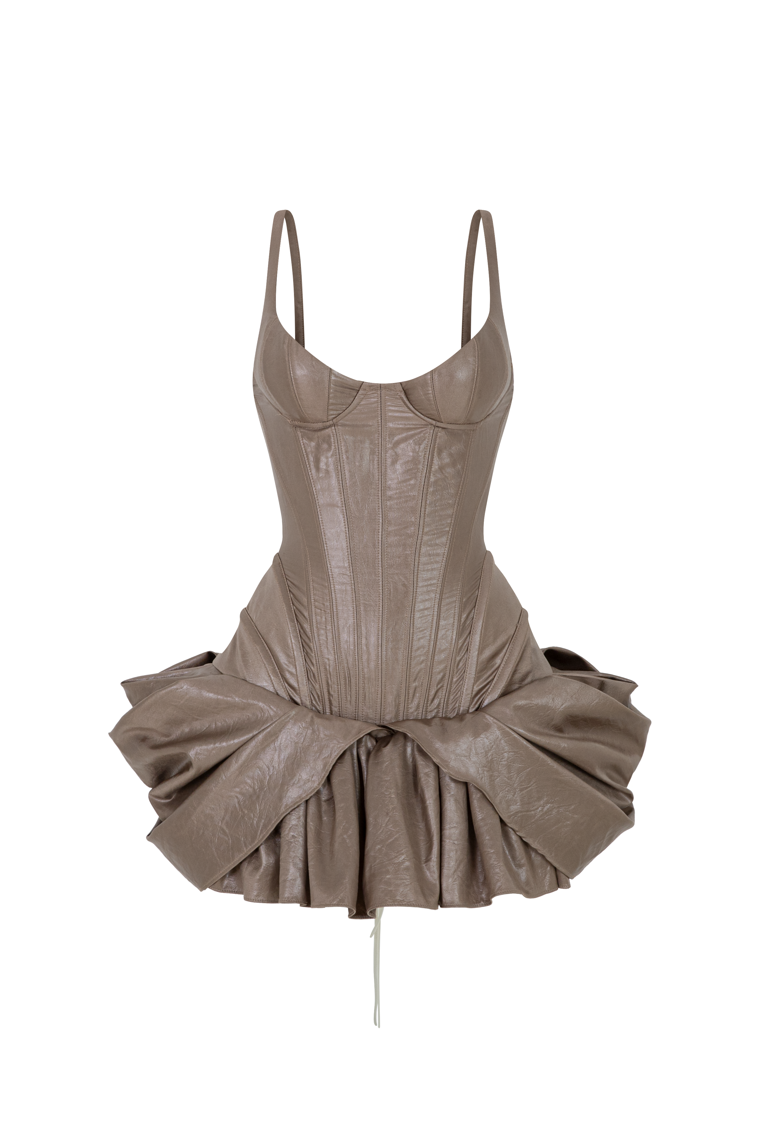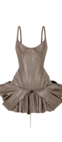 The dress expertly blends edgy sophistication with feminine detailing. Its drop waist silhouette elongates the figure, while the ruffled accents add dynamic texture and movement. Crafted from high-quality leather, this mini dress offers a sleek, structured fit with a modern, bold aesthetic. Perfect for making a confident statement, it combines refined craftsmanship with contemporary style.