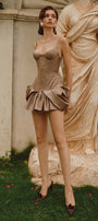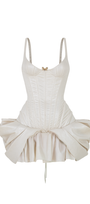 Special Features: Ruffled draped skirt, Corset waist with boning, Chest cup, Loose strap, Attached brand logo on the front
