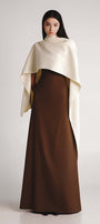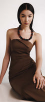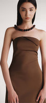 Embrace elegance with this dress tailored for a sleek and flattering fit. The design features a structured bodice that elongates the figure, a strapless neckline with subtle fold across the bust for a touch of femininity. With a quiet earthy tone, the high-quality, wrinkle-resistant cotton twill fabric with a smooth finish offers durability, comfort and style. A timeless piece perfect for formal occasions and elegant gatherings. The design comes with a contrasting cotton scarf that can be put together for an elegance style, or just used separately for warmth.