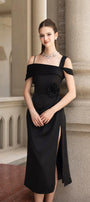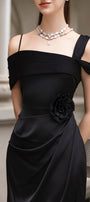 Special Features: Attached matching color 3D rose at waist, Pleated asymmetric shoulder , Side draped, High slit on the side, Back zipper