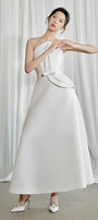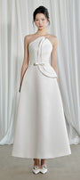 Folded sculptural overlay , Mini bow waistband, Peplum-inspired detail at waist