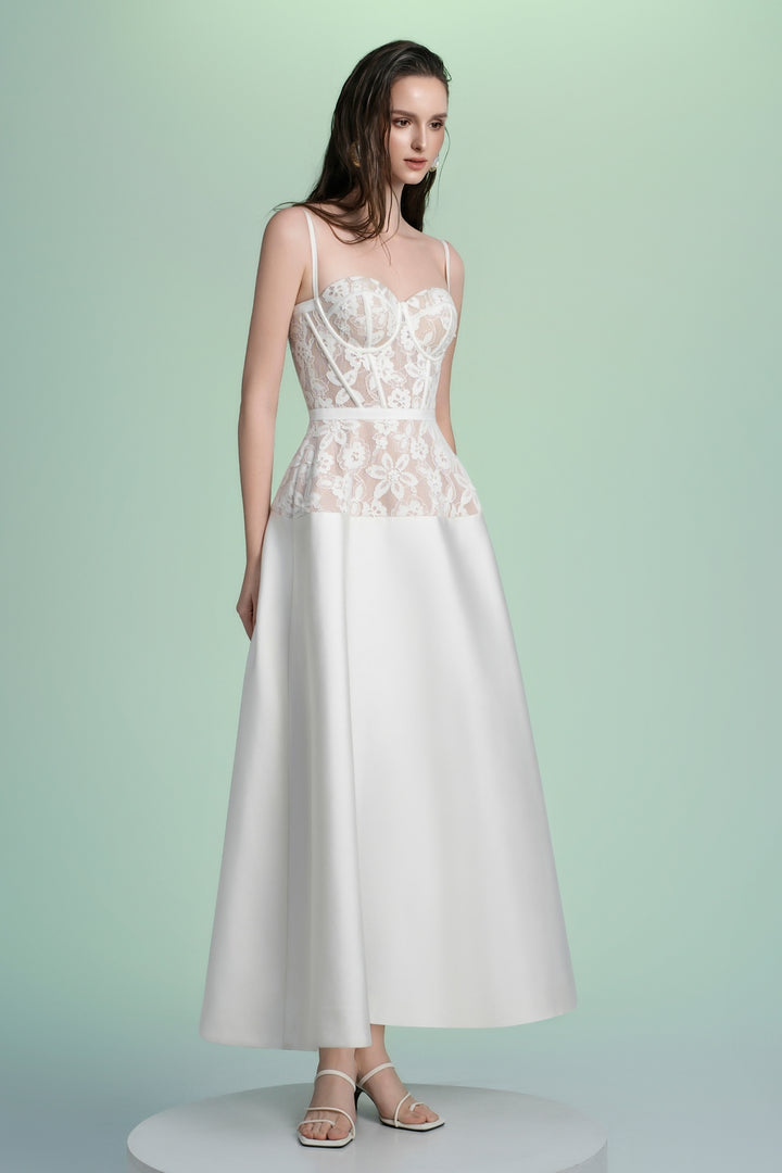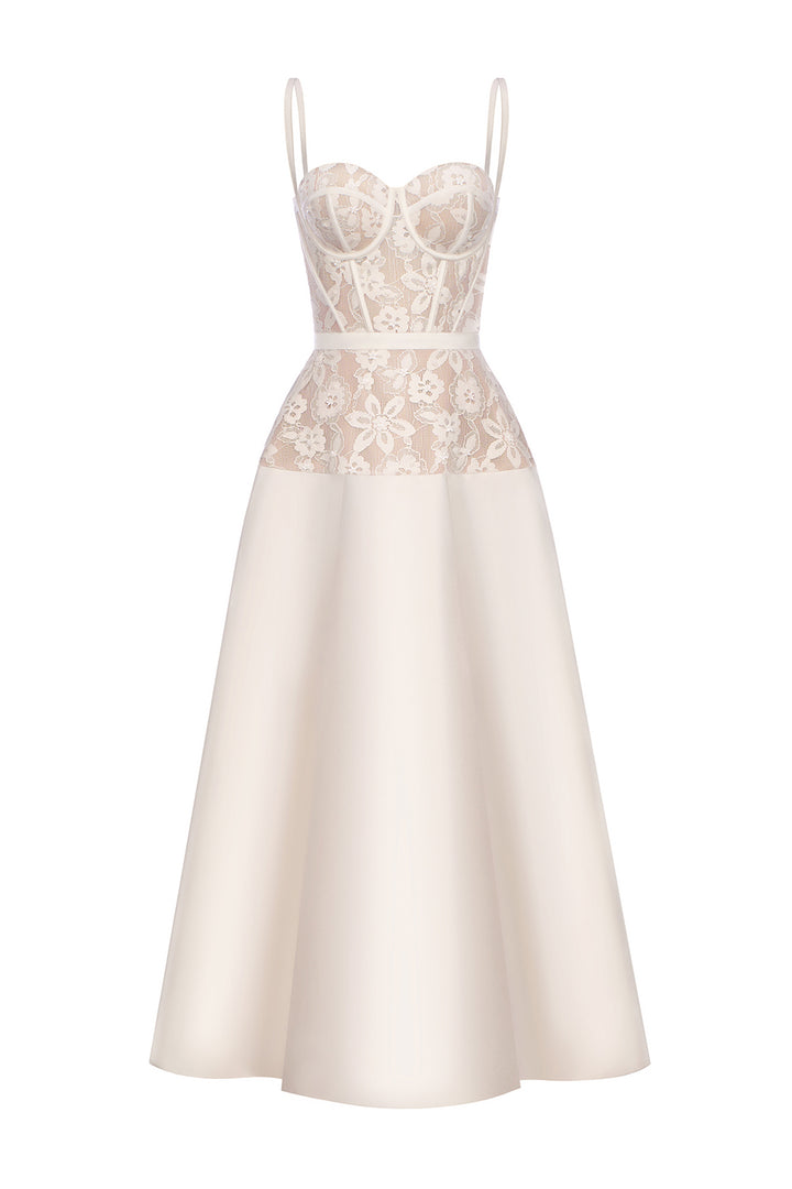 The dress features a structured chest cup design that enhances silhouette definition while providing support. Crafted from lustrous taffeta, this midi-length dress offers a refined shape with its classic A-line cut, ensuring both elegance and comfort. Ideal for formal occasions, it combines sophisticated tailoring with a flattering fit to elevate your wardrobe.
