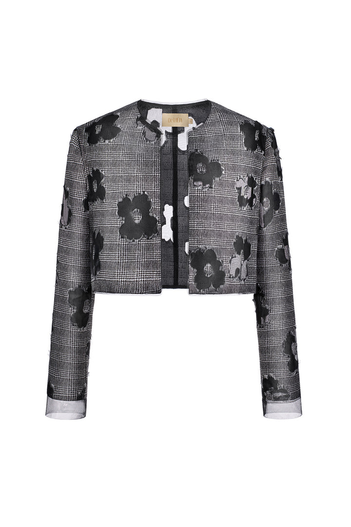 The jacket features a tailored fit with a refined floral pattern, crafted from premium taffeta fabric. Its cropped length offers a modern silhouette that pairs seamlessly with both formal and casual ensembles. Designed for versatility and style, this jacket adds a sophisticated touch to your wardrobe while providing structured comfort and elegance.