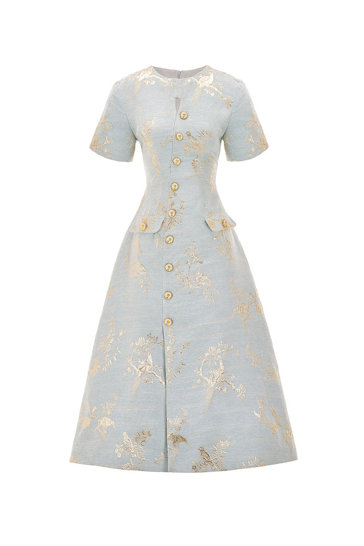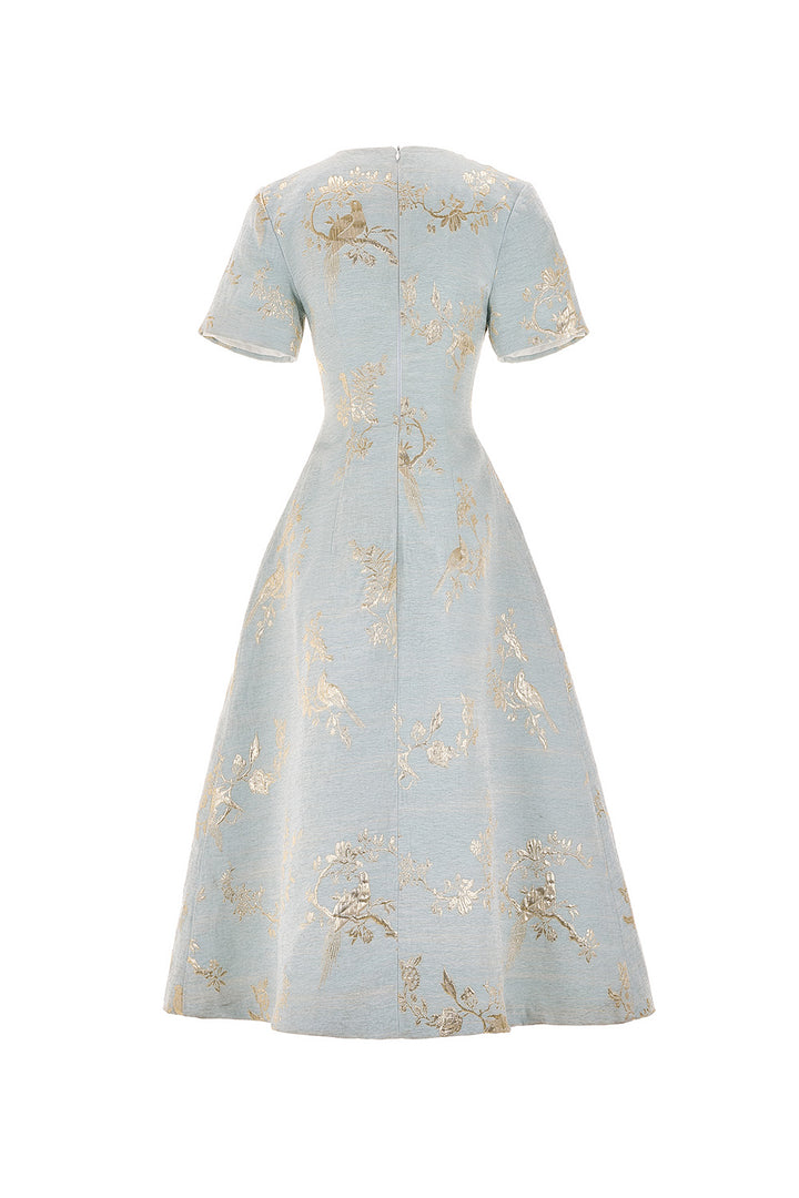 This dress combines elegant style with comfort. The A-line silhouette flatters any body shape, while the round neck adds a unique touch. Made of high-quality brocade fabric, this midi dress is perfect for any semi-formal occasion.
