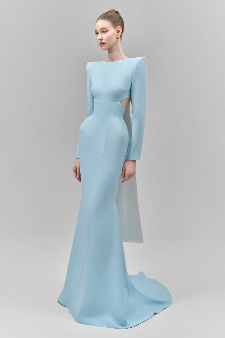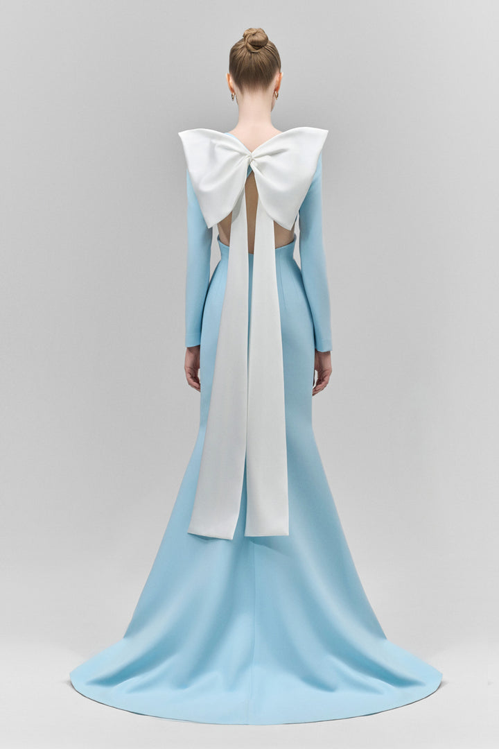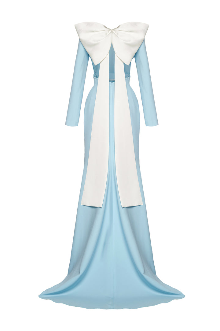 This elegant polyester floor-length dress features a sophisticated boat neck and a striking cut-out waist that enhances your silhouette. The dramatic big bow on the back adds a distinctive, refined touch, making it an excellent choice for formal occasions where style and craftsmanship are paramount.