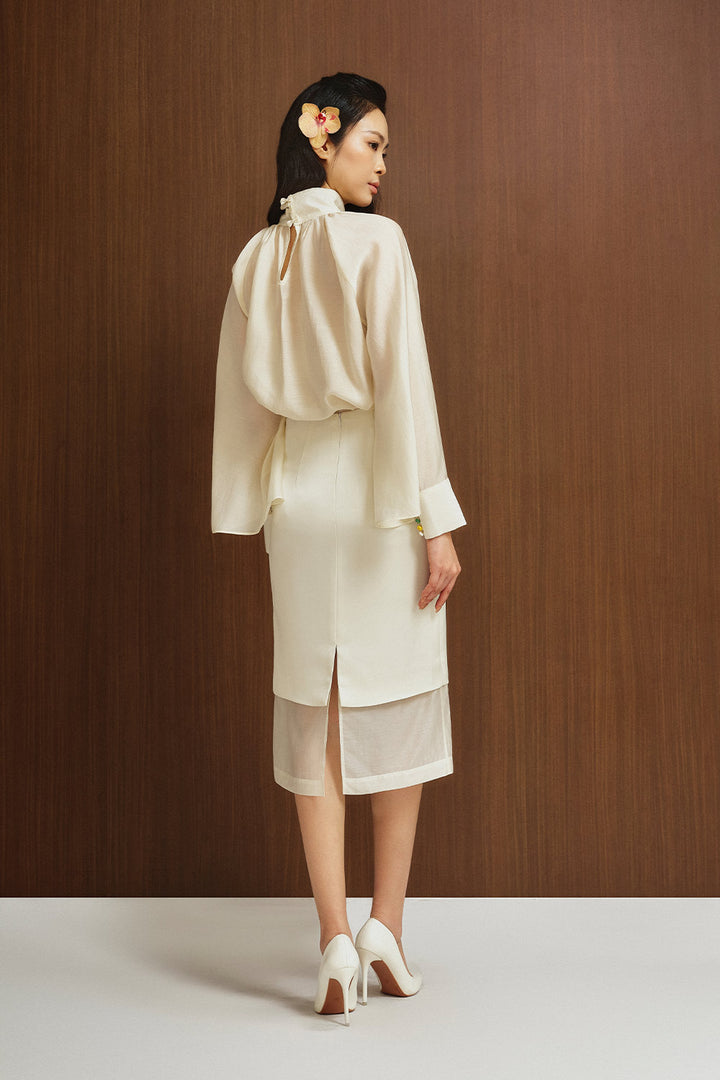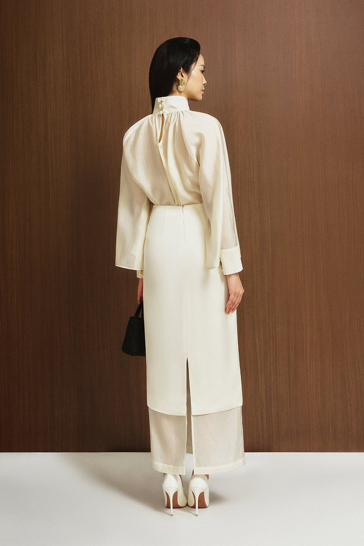 Special Features High slit cuffs with multicolor button line, High collar with bow line at the back, Gathered detail around the neck, Slit back, Sheer effect