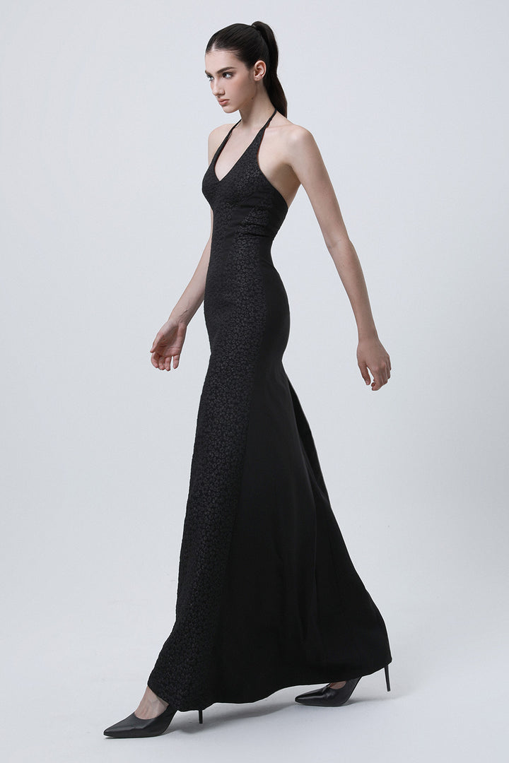 Criss-cross Trumpet Halter Neck Brocade Maxi Dress