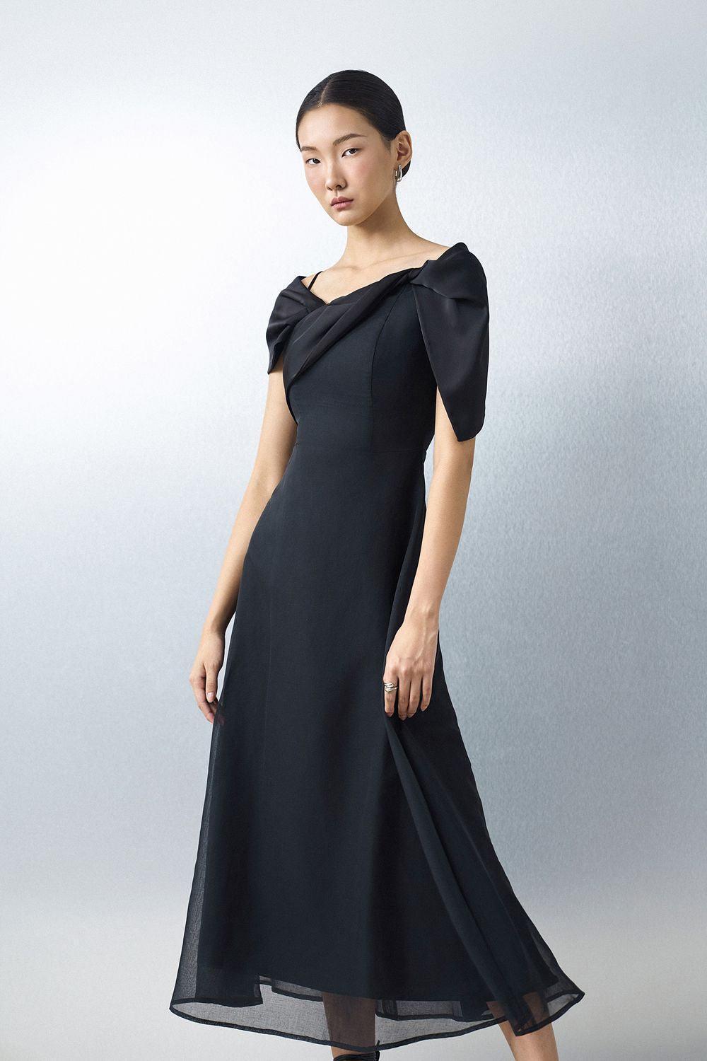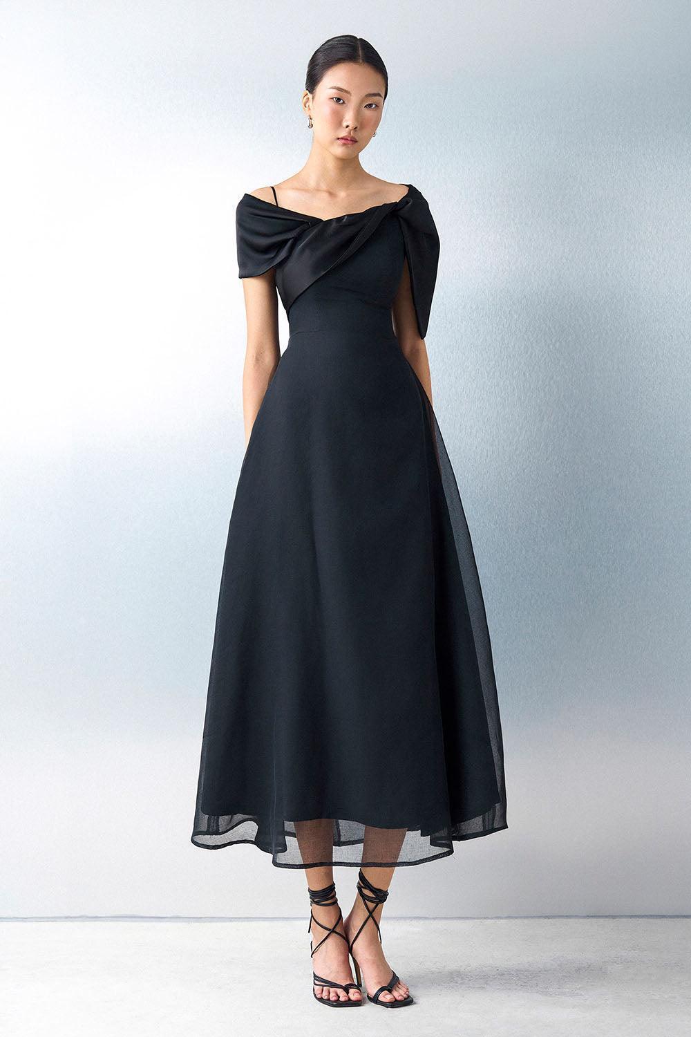 Asymmetrical twisted neckline, One shoulder strap, Dart lines, Double-layered skirt, Back zipper