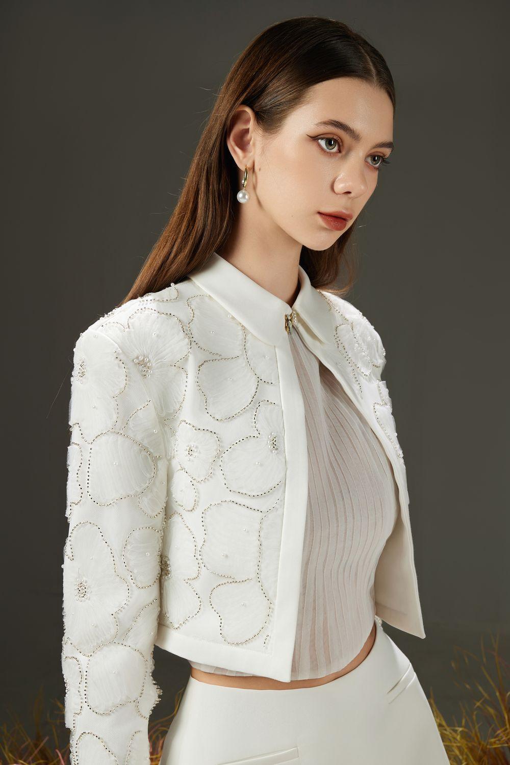 Embroidered 3D flowers along the jacket
