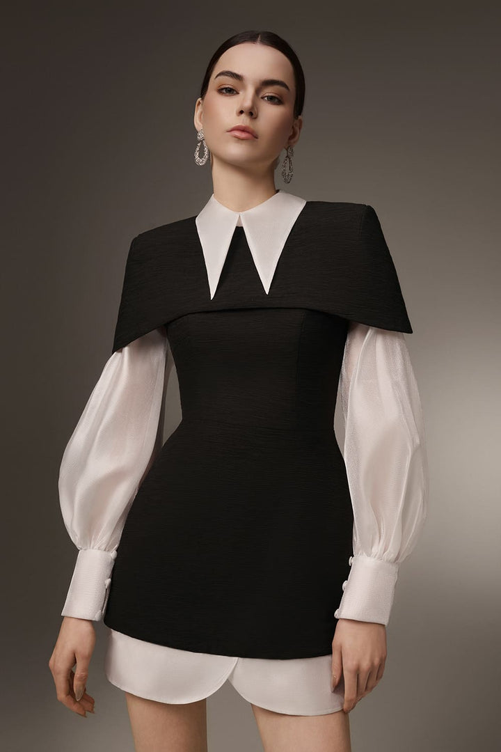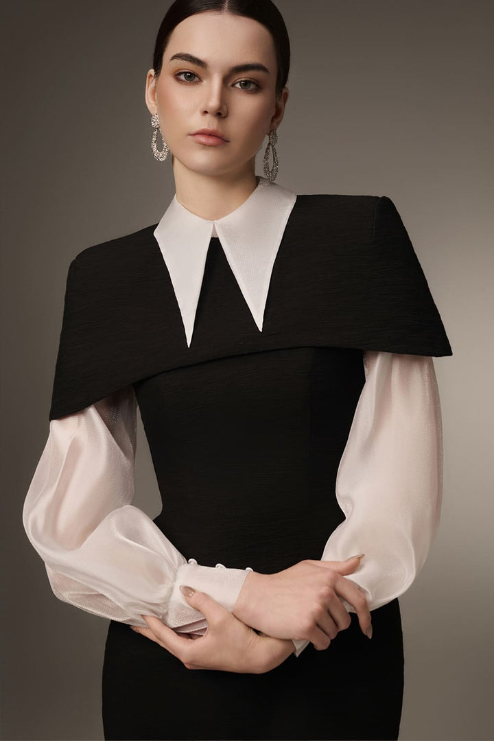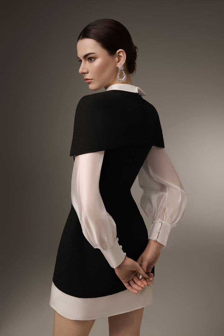 Enhance your wardrobe with our dress. The elegant mix of black and white adds a touch of sophistication, while the cape shoulder and cuff sleeves provide a chic silhouette. Complete with a pointed collar, this dress is perfect for any occasion.