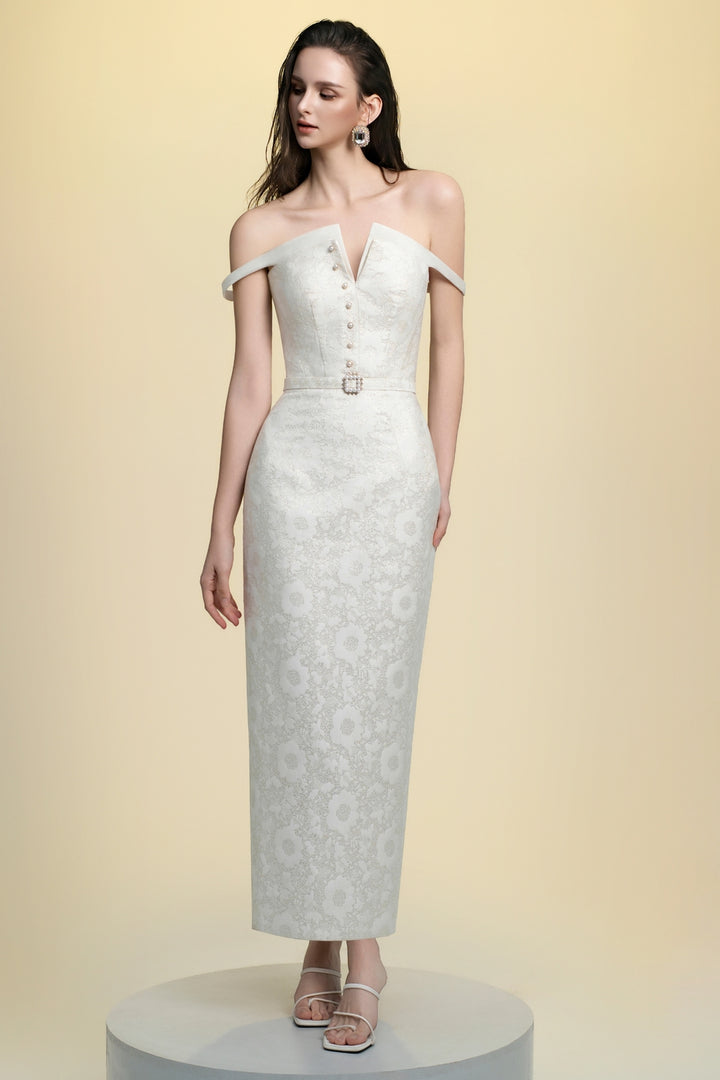Donatella Sheath Slit Neck Jacquard Midi Dress