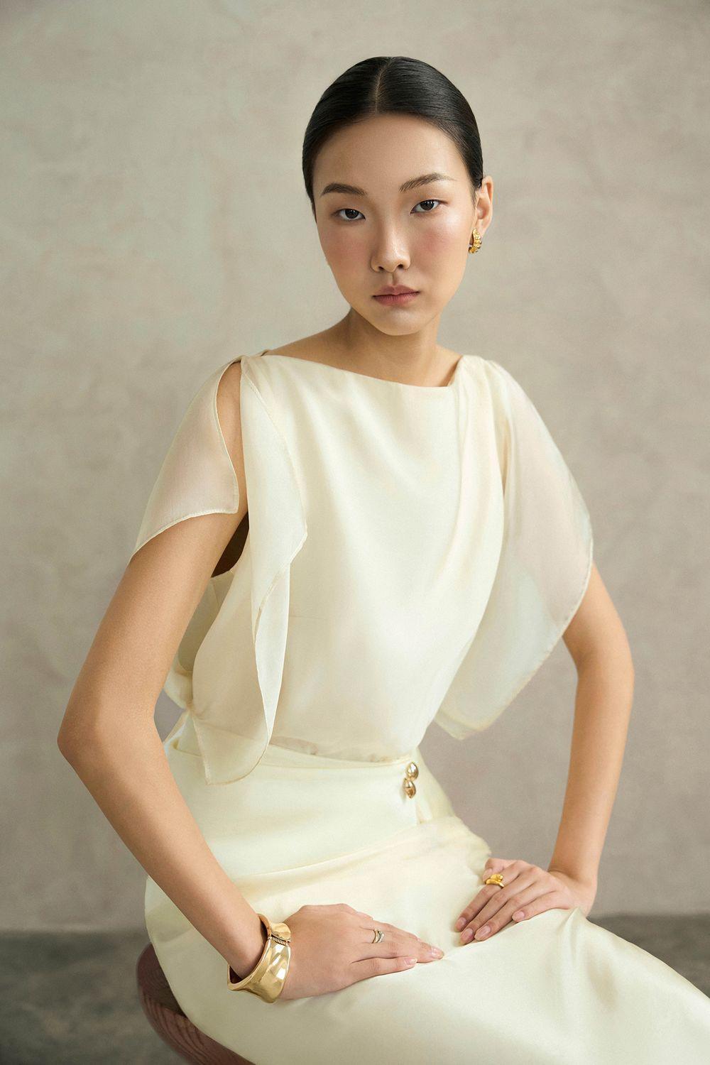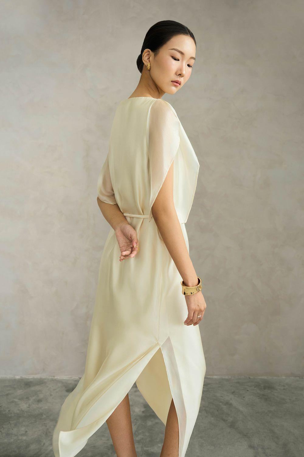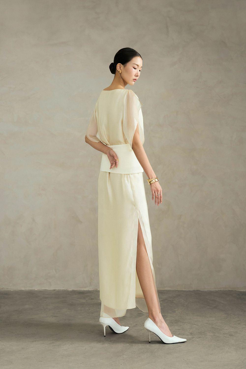 Sheer sleeves, Metal button accent in taffeta belt, Double-layered, Side slits