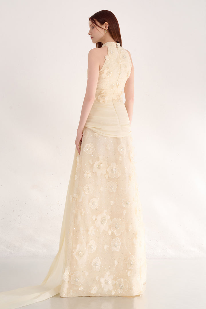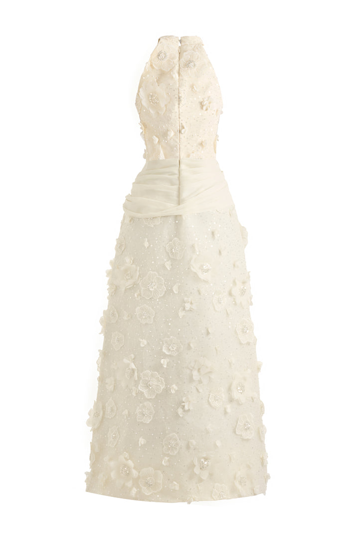 The dress combines timeless elegance with modern design. Crafted from smooth polyester, it features a flattering A-line silhouette that flows effortlessly. The halter neck detail highlights the shoulders and neckline, adding a sophisticated and stylish touch. Lightweight and comfortable, this dress is ideal for formal occasions or evening events where grace and poise are essential.