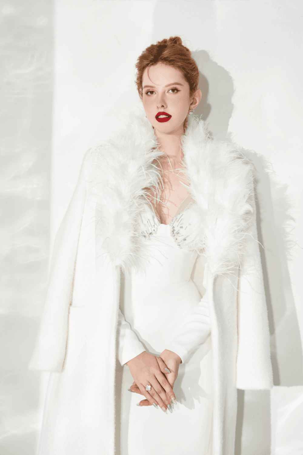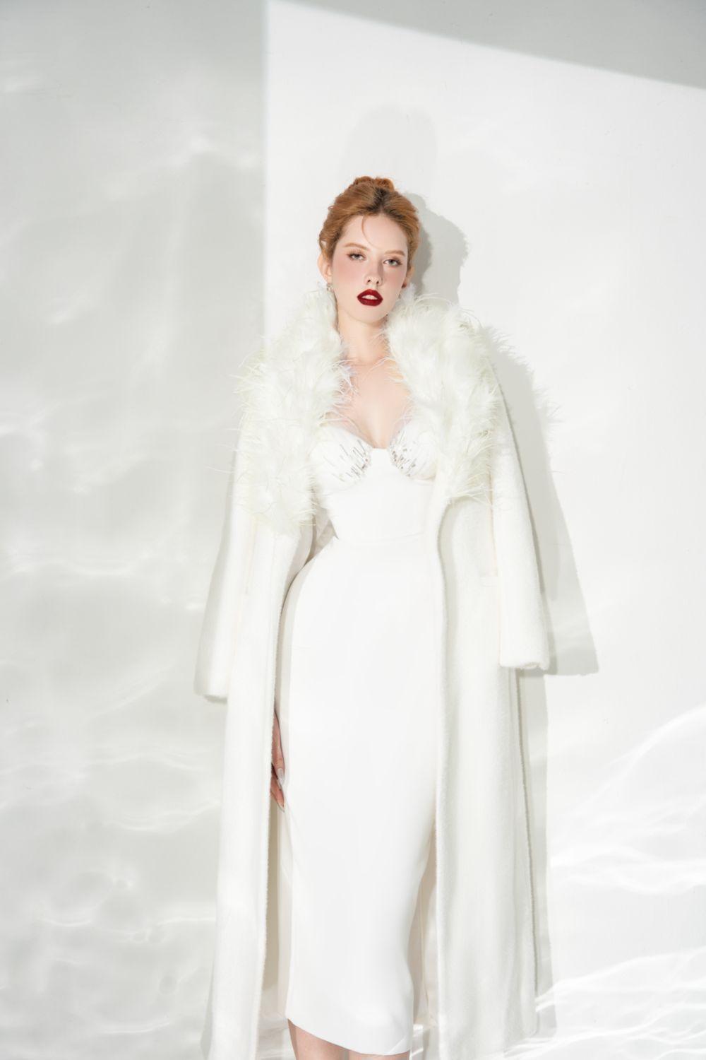 Feather attached around neckline, Coat has no buttons
