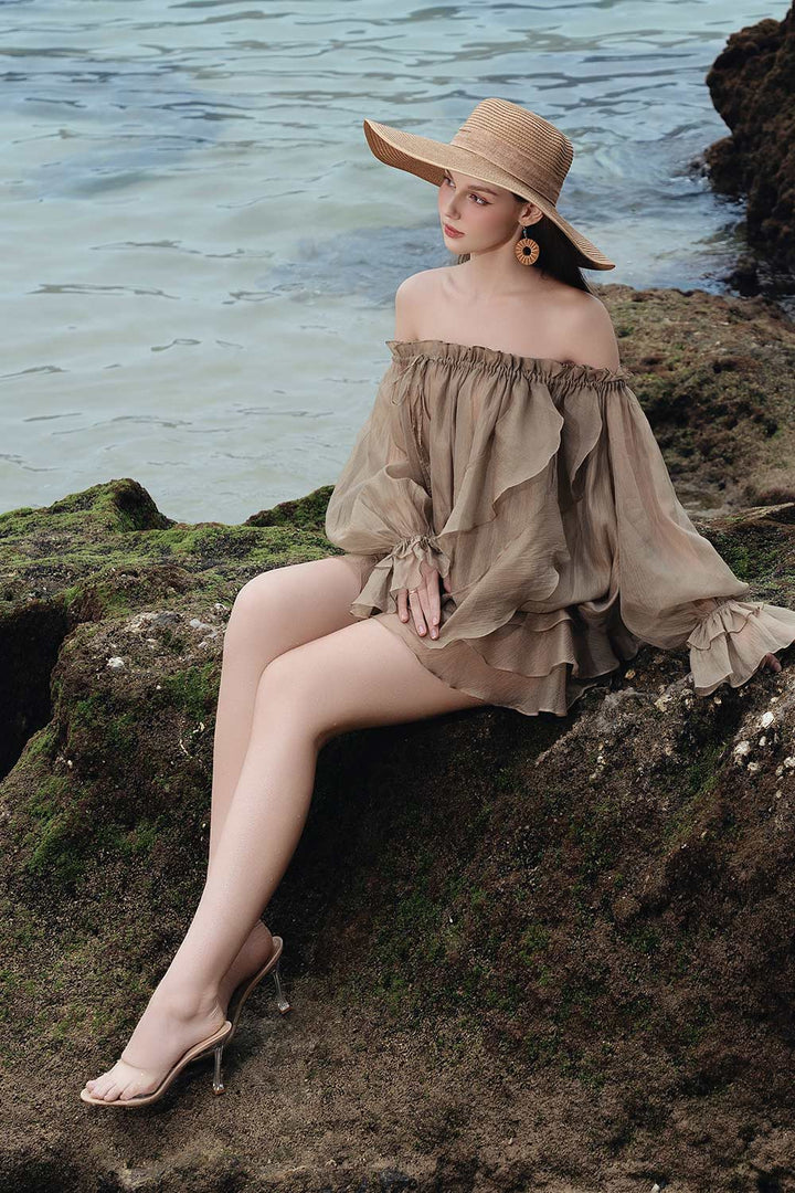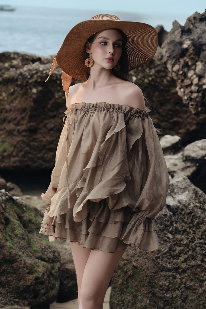 Special Features Off-shoulder poet sleeves, Gathered neckline with drawstring, Ruffle layer skirt