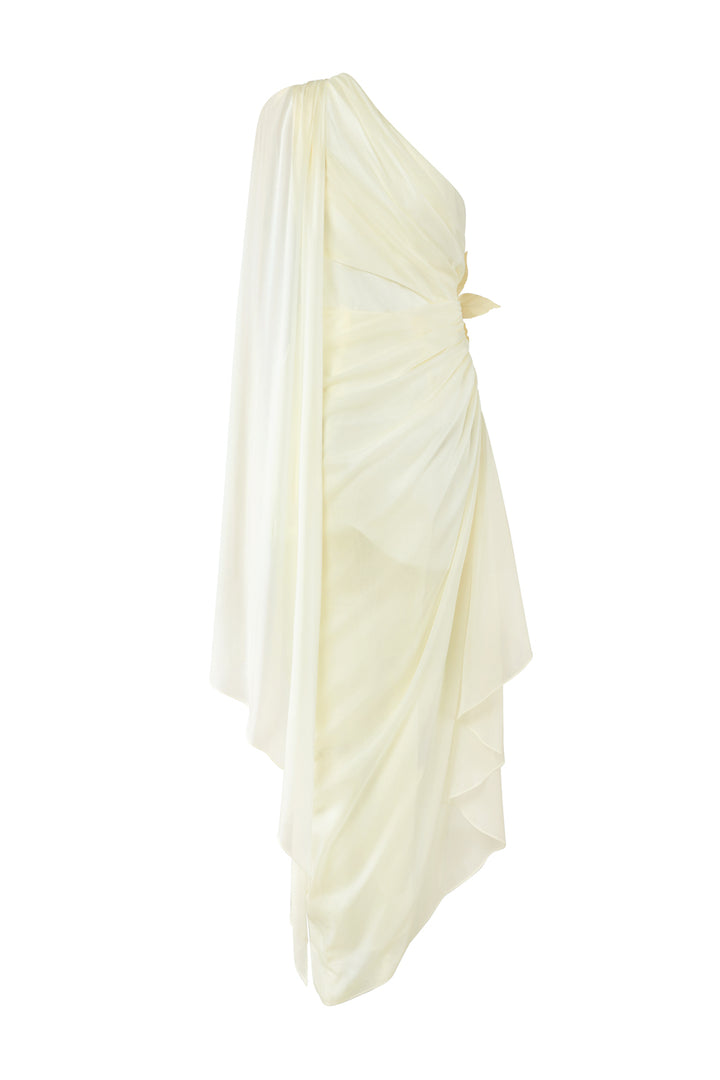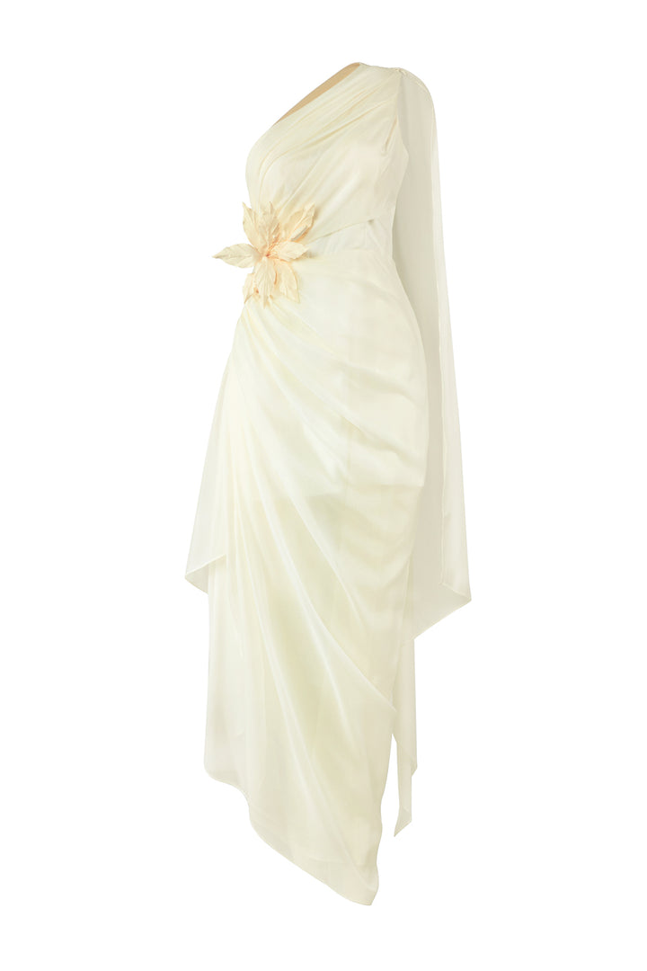 The midi dress features a sophisticated one-shoulder design paired with a delicately gathered bodice, creating an elegant silhouette that flatters the figure. Crafted from lightweight silk organza, this midi dress offers a refined texture and subtle sheen, perfect for occasions that call for understated luxury. Its design draws inspiration from timeless muses, blending classic artistry with modern tailoring to elevate your wardrobe with effortless grace.
