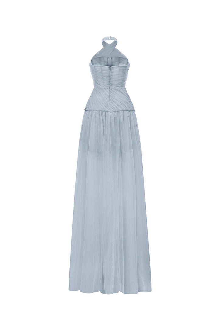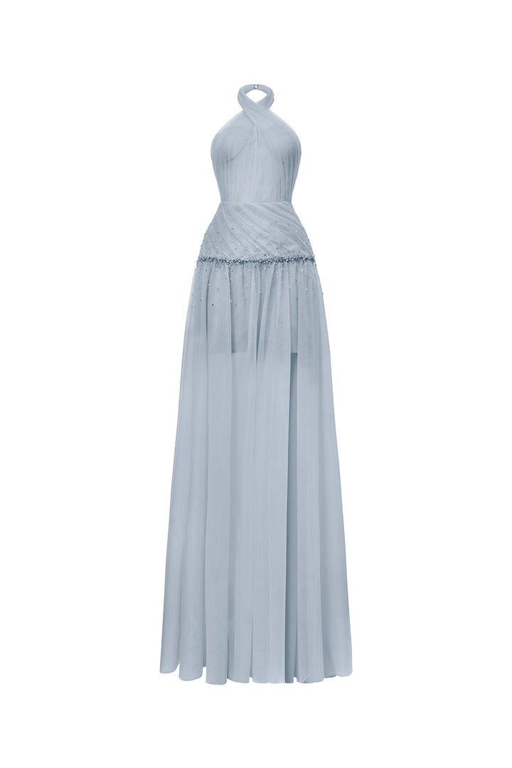 Elevate your formal look with the dress. Expertly crafted with criss-cross neck detailing and mesh fabric, this dress exudes sophistication. Its floor length design adds a touch of elegance, perfect for any special occasion.