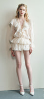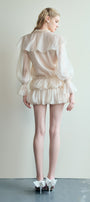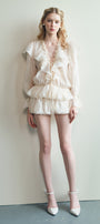 The mini dress showcases expert craftsmanship with its bubble layered hem and elegant ruffle collar. Made from delicate organza, this dress combines volume and structure to create a refined silhouette that enhances your presence at any event. Its thoughtful design balances playful texture with sophisticated style, making it a standout piece for a polished wardrobe.