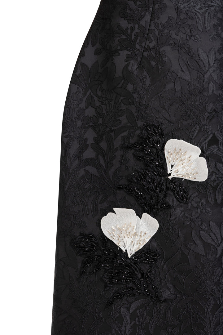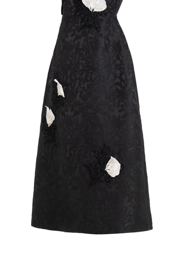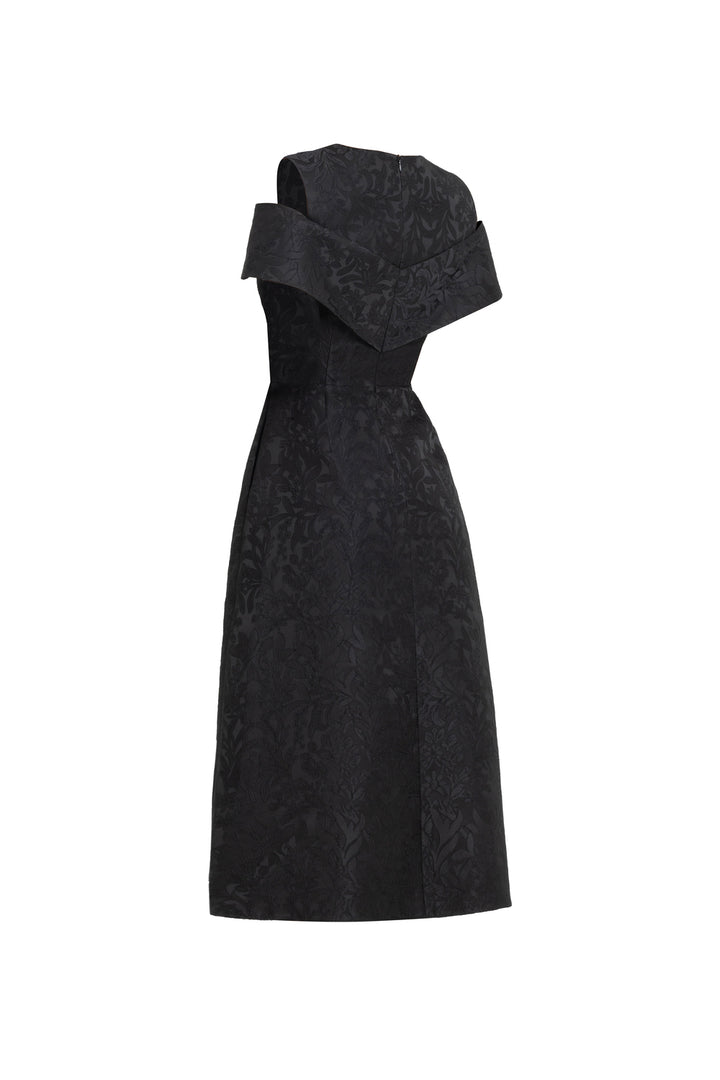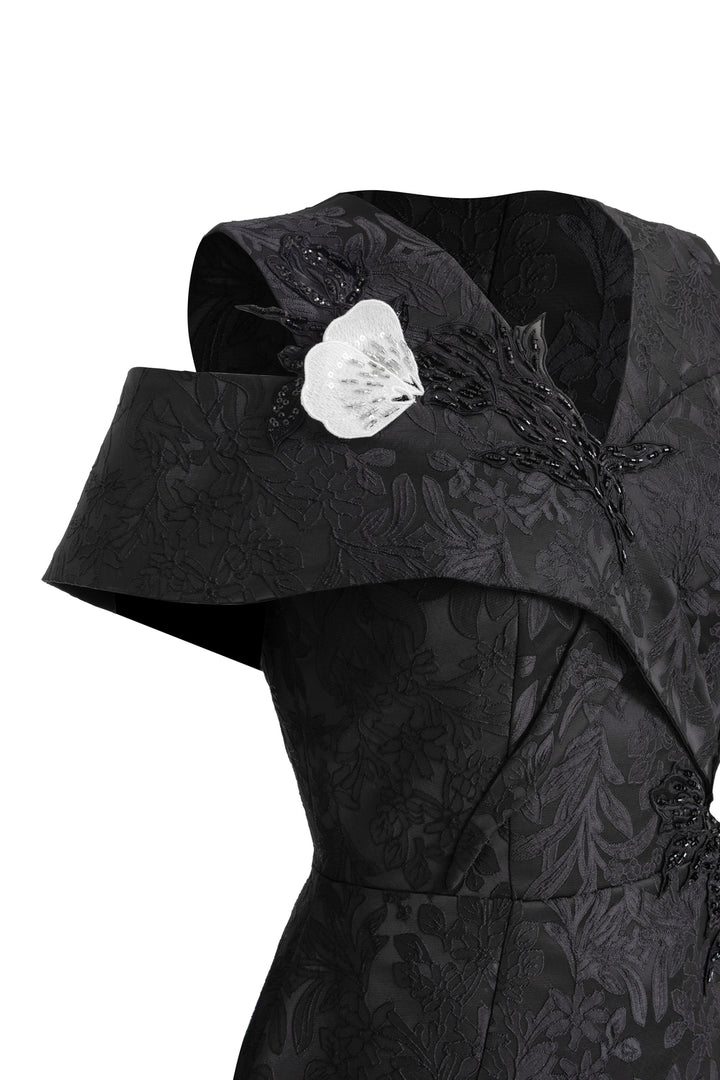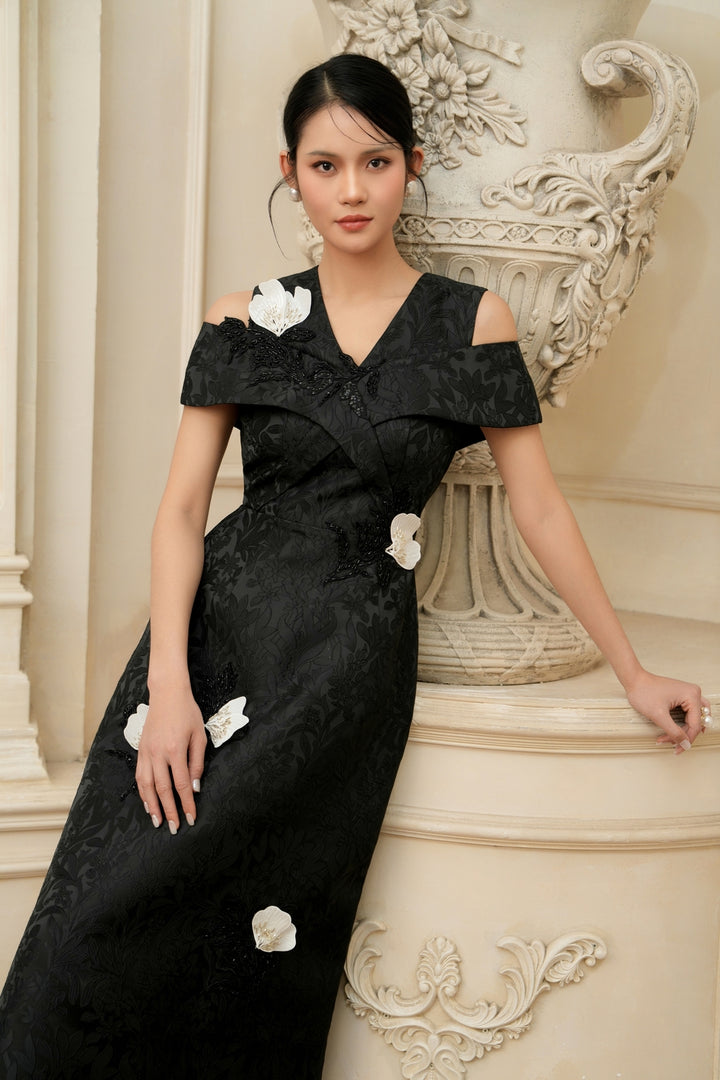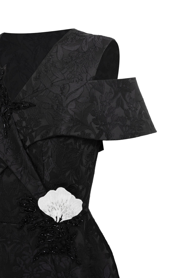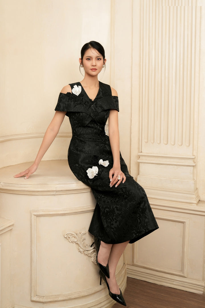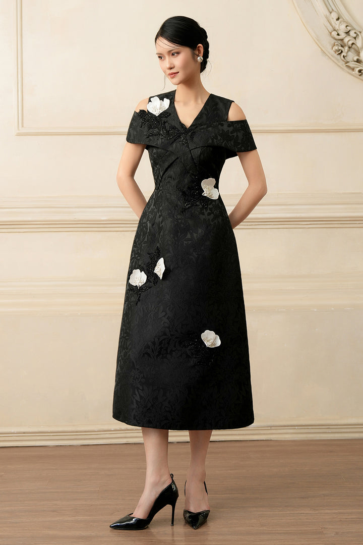 This midi dress features elegant cold shoulder sleeves and intricate jacquard fabric. Delicate floral petal embroidery adorned with beads adds a refined, textured detail, making it perfect for sophisticated occasions. The design balances classic structure with modern embellishments for a polished, expert look.