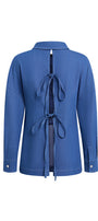 Special Features: Collared neck with metal buttons row, Cut-out at the back with ties, Slit on the side, Cuff sleeves, Drop shoulder seam