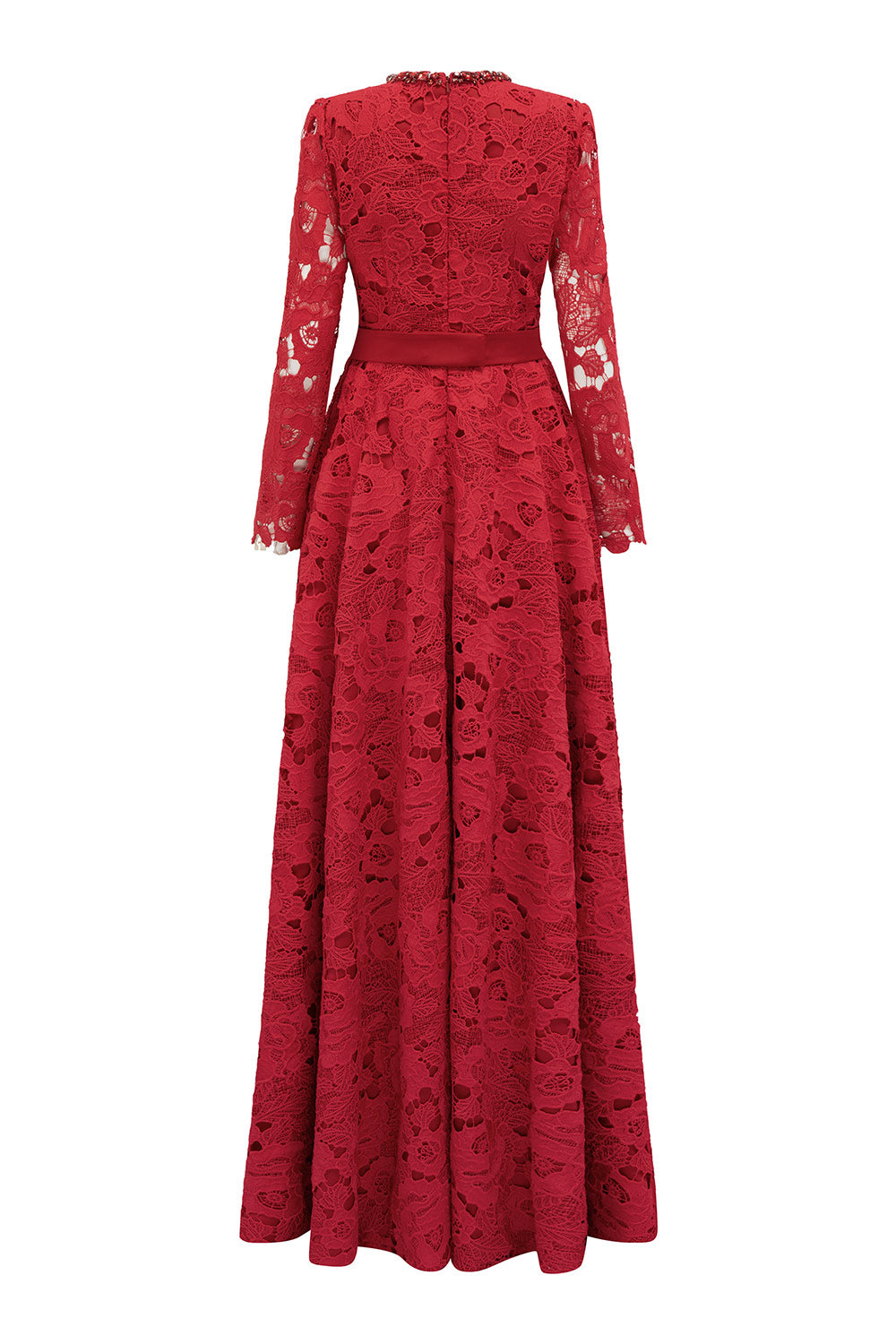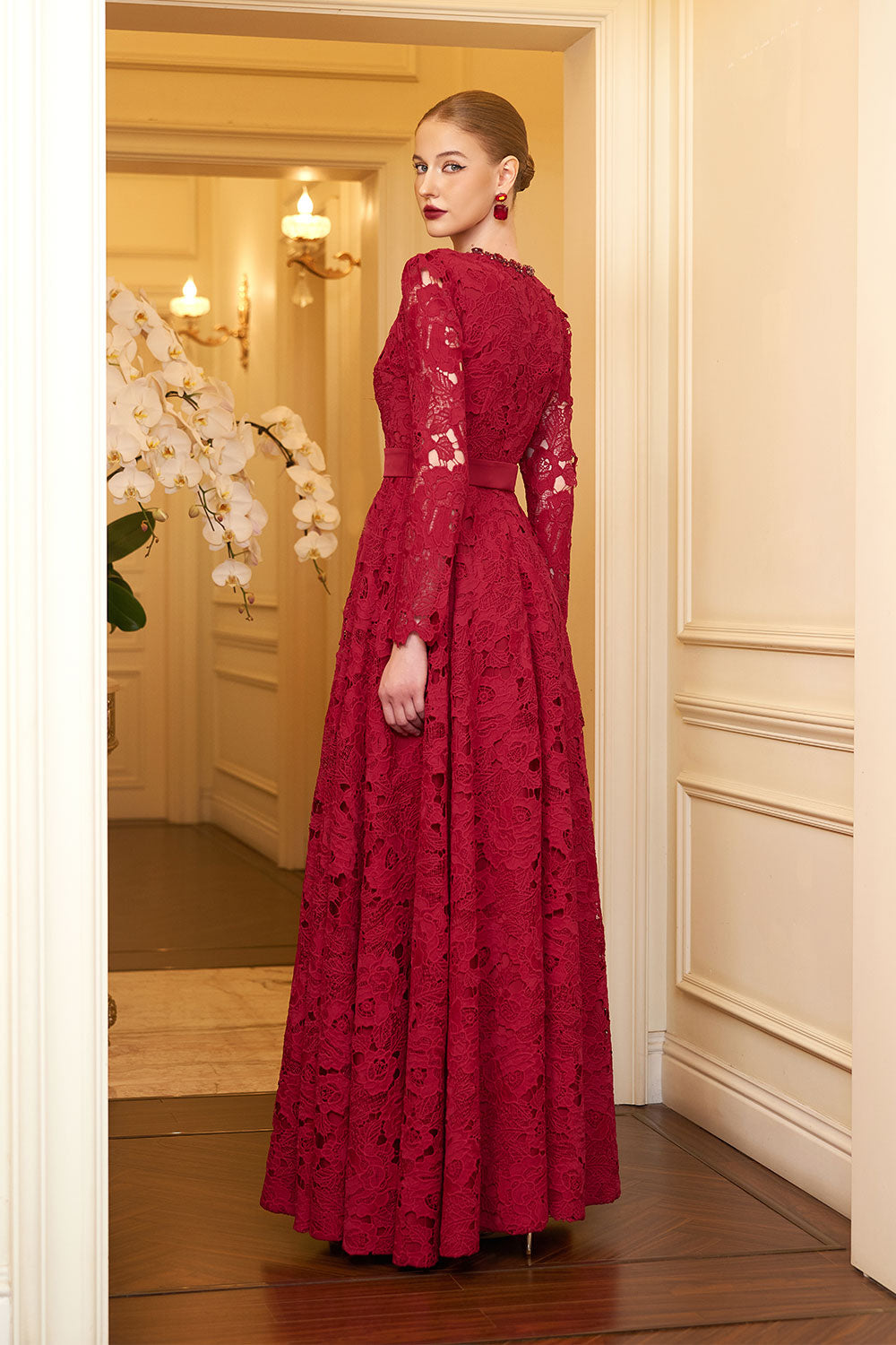 Embellished crystal on belt and neckline, Draped flare at the bottom, Outer lace layer