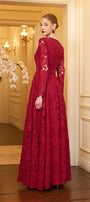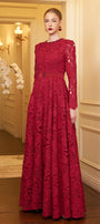 Elegance meets sophistication in this dress. The exquisite lace and crystal embellishments on the neckline and belt add a touch of glamour. With a full ball gown silhouette, this floor length dress is perfect for any formal occasion.