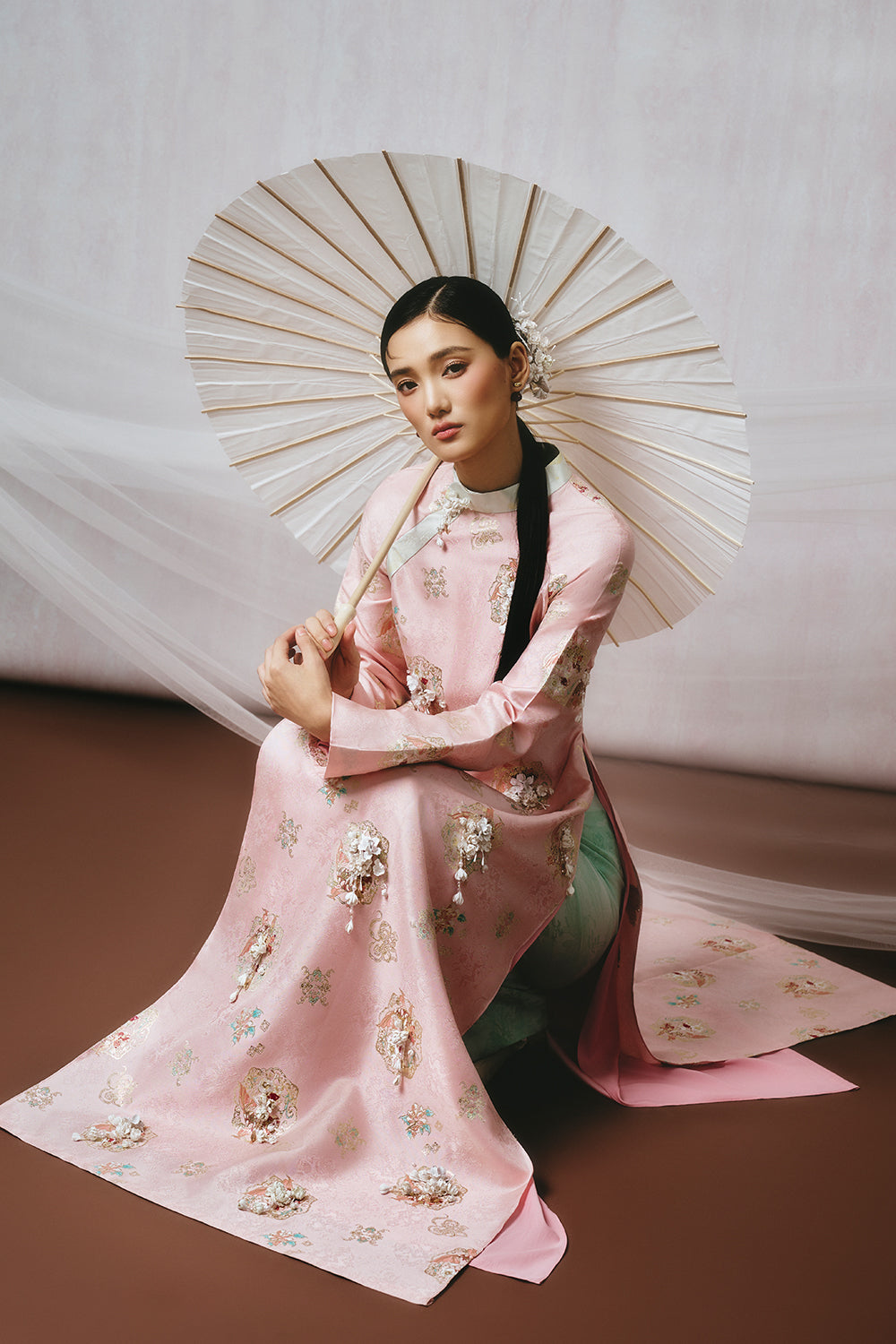 Experience sophisticated elegance with this straight silhouette Ao Dai, featuring a refined mandarin neck, regular sleeves, and exquisite brocade fabric adorned with delicate bead embellishments. Perfect for weddings, festive celebrations, or cultural events where timeless beauty is desired.
