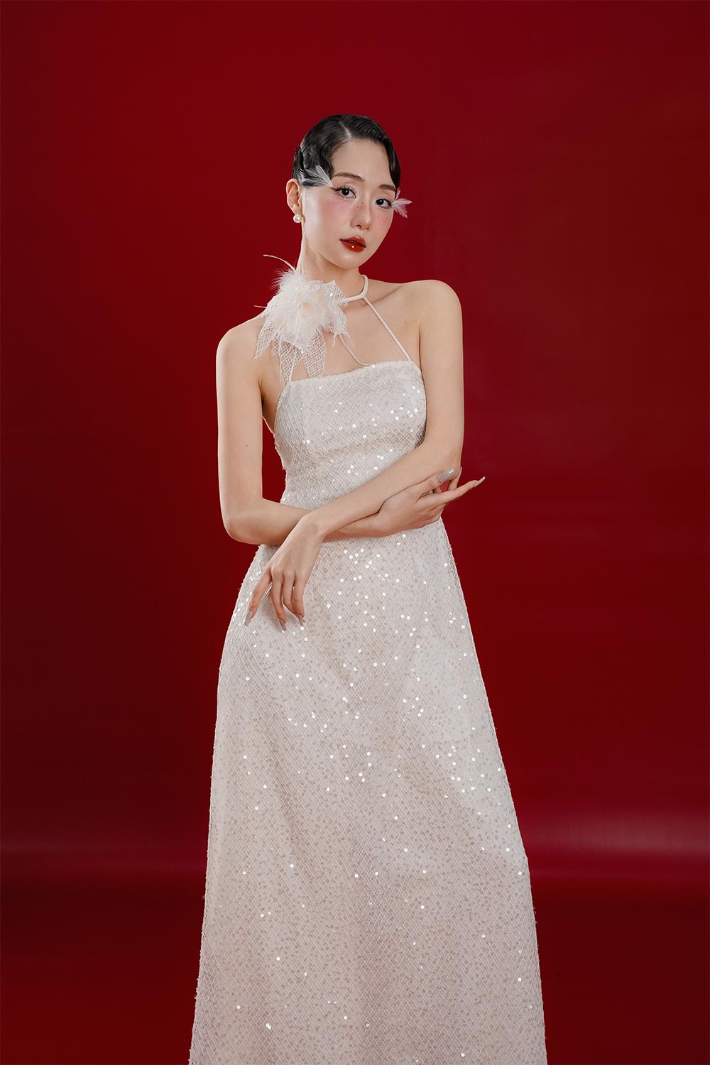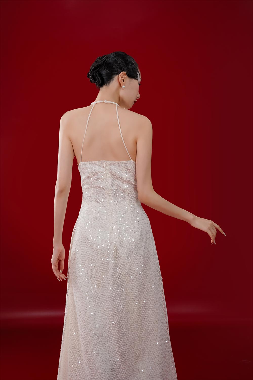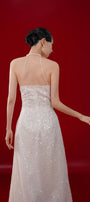 This Ao Dai features an A-line silhouette and sleeveless design, crafted with delicate mesh fabric and adorned with sparkling sequins. Perfect for formal events, this floor length ao dai showcases a blend of elegance and glamour.