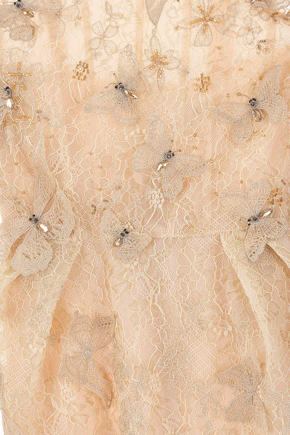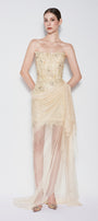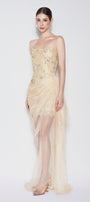Special Features: Corset design, Butterfly applique, Floral lace pattern, Sheer chiffon layer wrap-around at waist, Sarong at the side