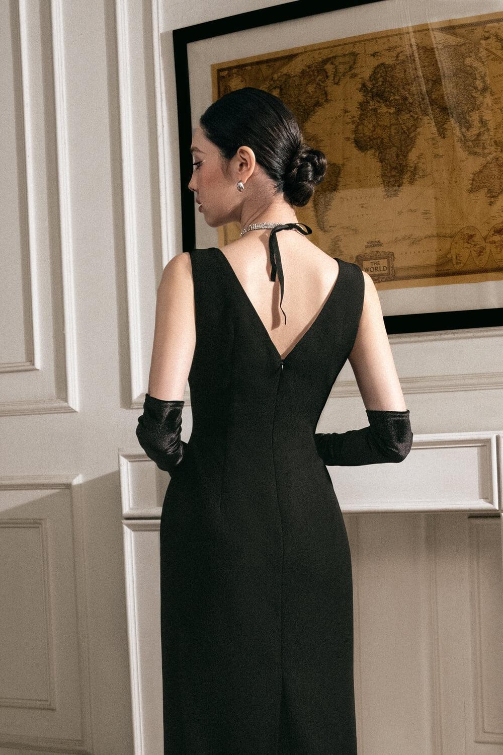 The dress proves its charm when transforming impressively on a classic black tone with a sheath silhouette and a deep V-neck that is perfect enough to flatter her physique and elegance. Delicate dart lines also contribute to enhancing her ideal curves.