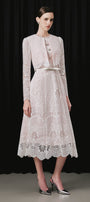 The dress showcases an exquisite floral laced pattern that creates depth and visual interest throughout. Its sleeveless design offers elegant shoulder exposure while maintaining sophistication. The signature bow leather belt defines the waistline, creating a balanced silhouette that complements the A-line structure. A masterful combination of delicate detailing and refined construction for discerning tastes.