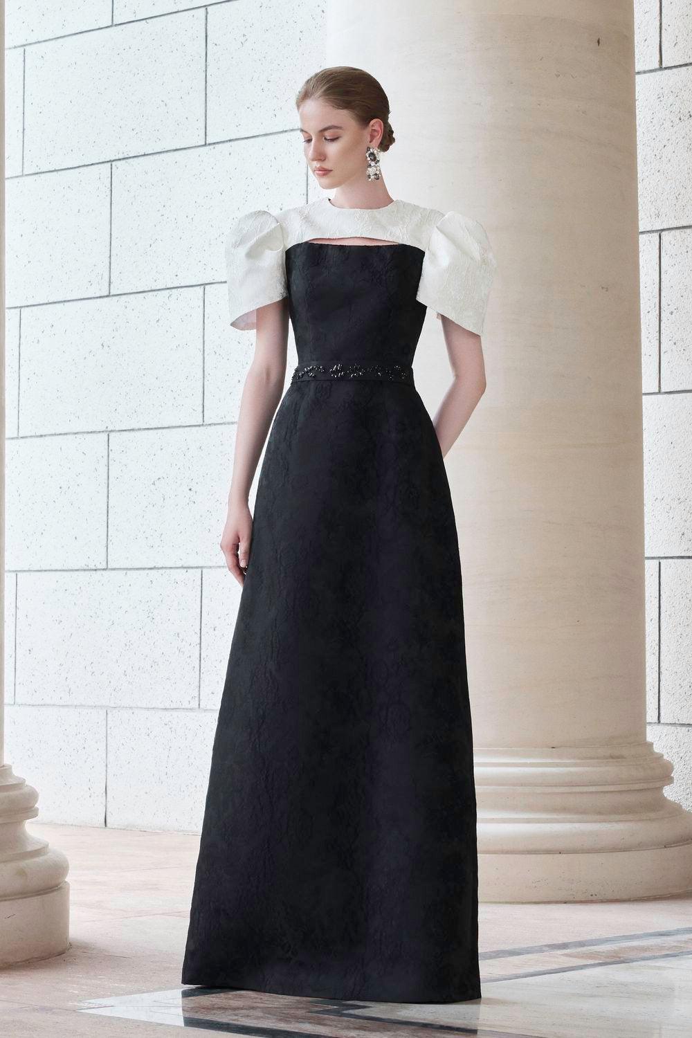 White yoke tulip sleeves, Cut-out and contrast-mix black body, Attached stones on the waistband