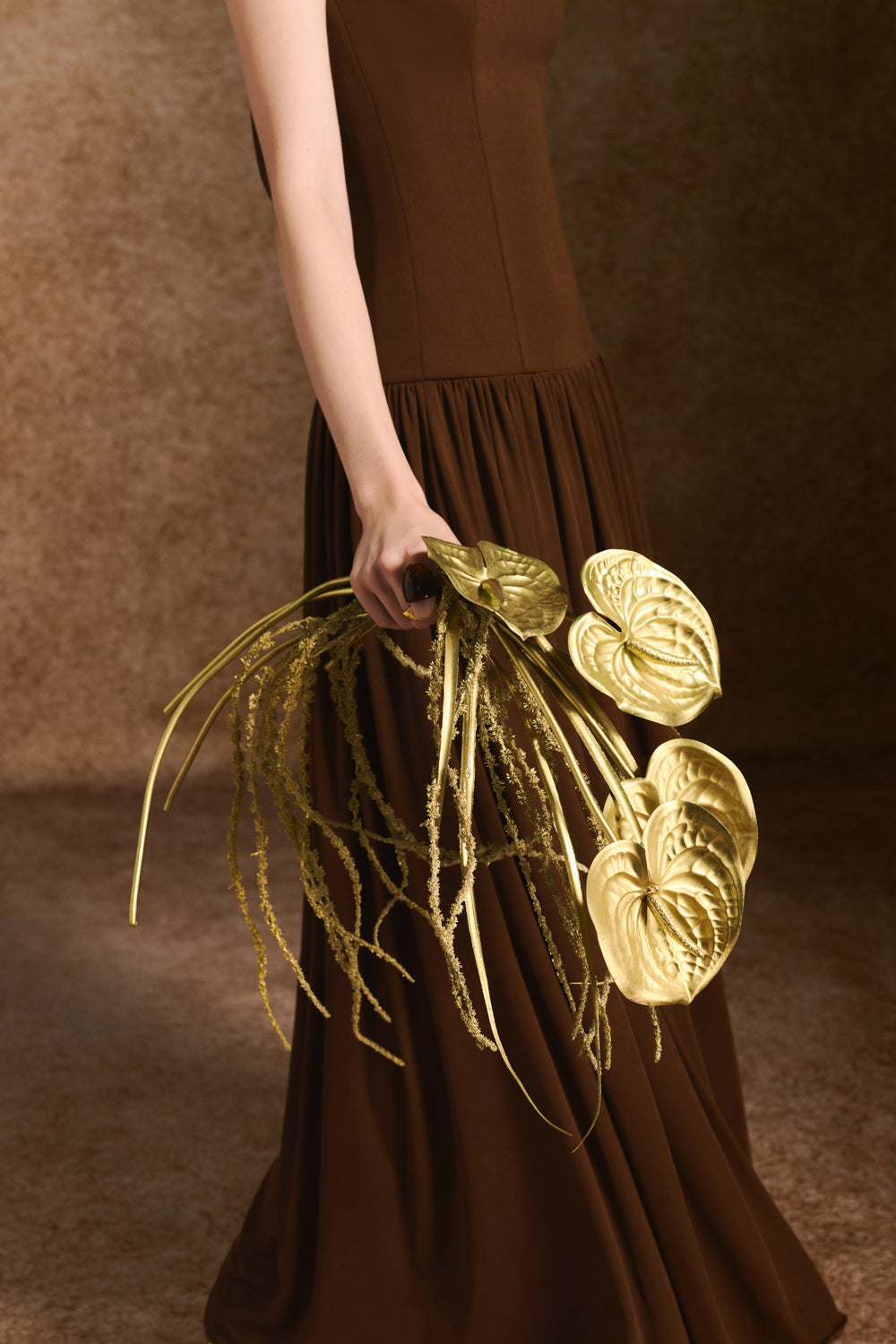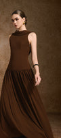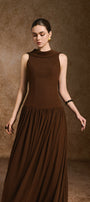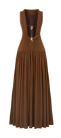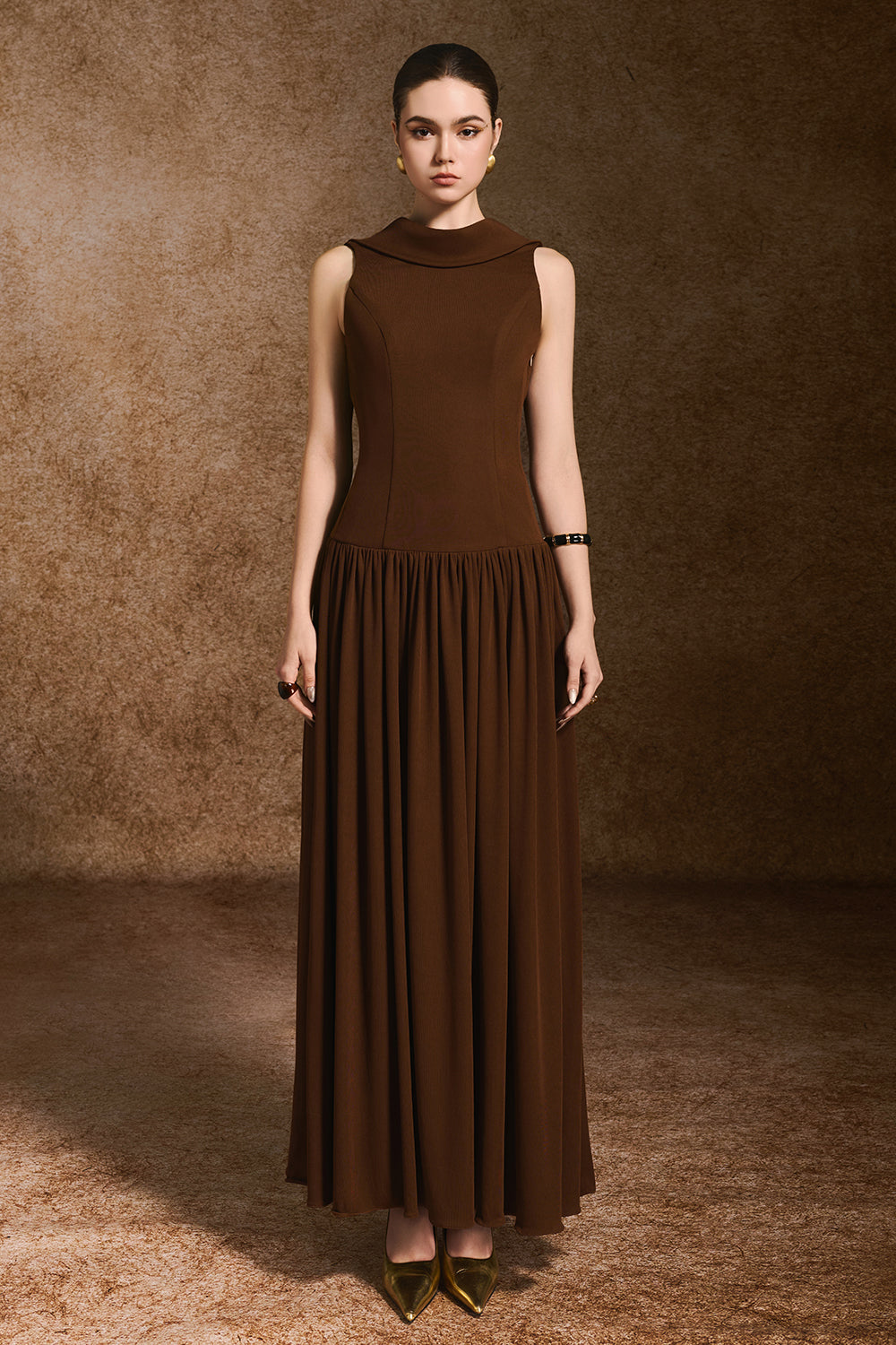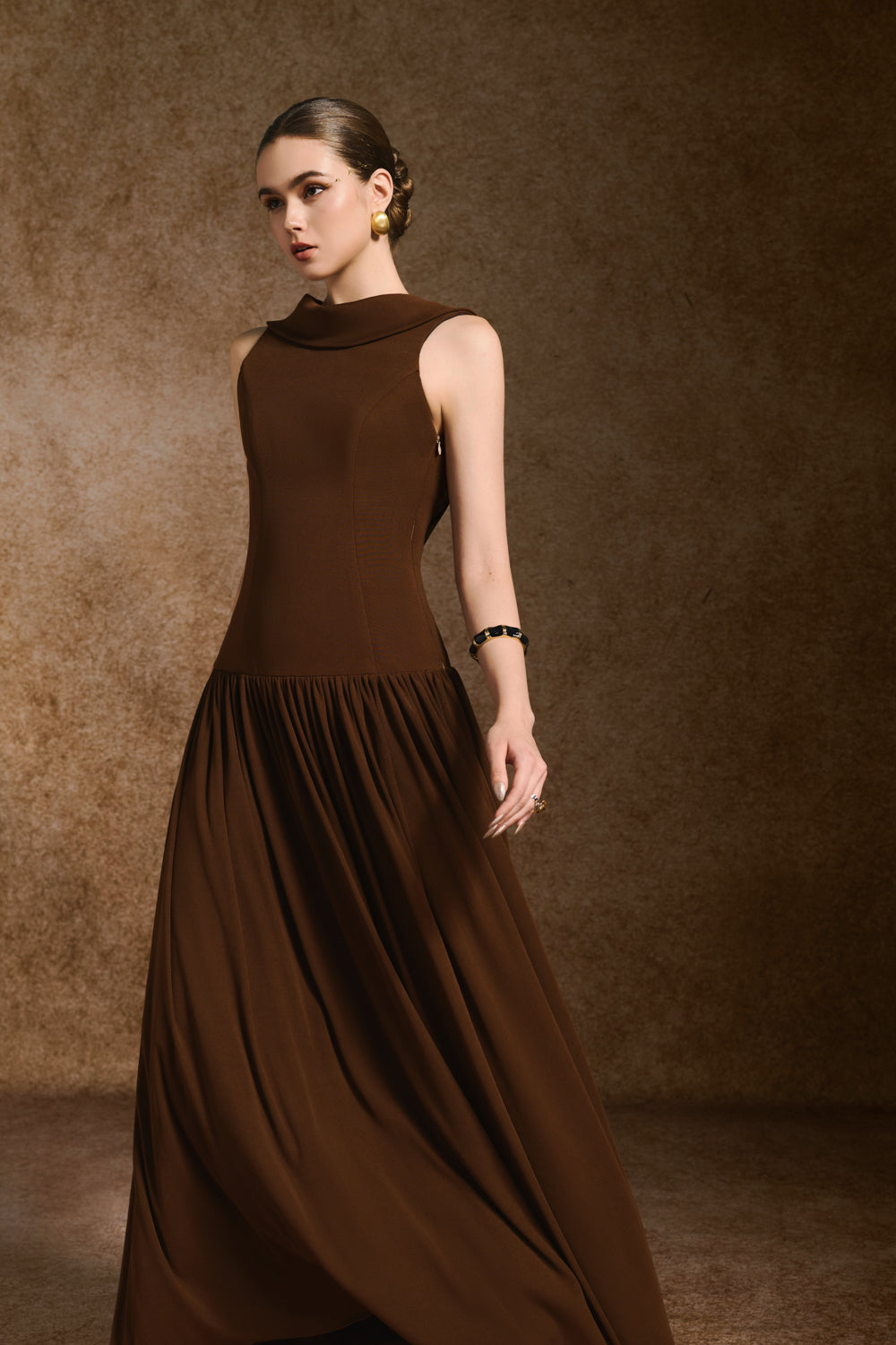 High draped neck on the front, Cowl at the back with tie and gold ornamental, Dart lines, Flowy pleated skirt