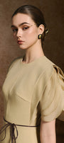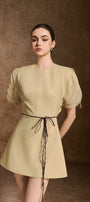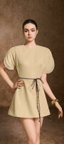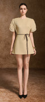 The mini dress features expertly designed, puffy tulip-layer sleeves that add dimension and a refined silhouette. Crafted to enhance movement and style, these sleeves provide a sophisticated puffed effect while maintaining comfort. The khaki tone complements the structured A-line shape, making this mini dress a versatile choice for polished, contemporary looks.