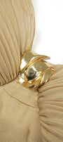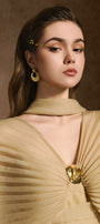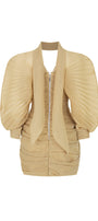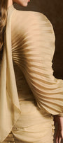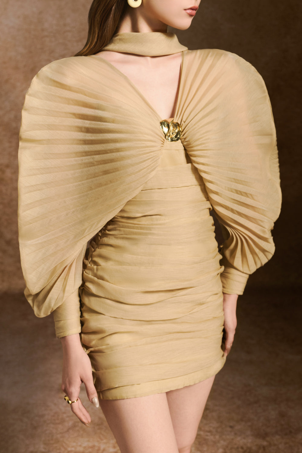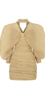 The mini dress features elegant batwing pleated sleeves that add a dramatic flair, perfectly balanced by a gathered bodice that enhances the silhouette. Crafted for a flattering fit, this dress combines structured detailing with soft muslin fabric, making it an ideal choice for sophisticated occasions where style and comfort are paramount.