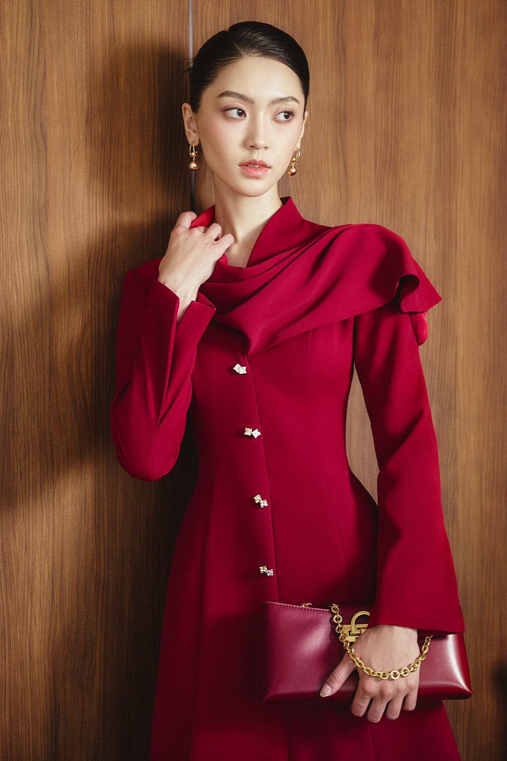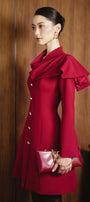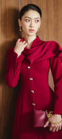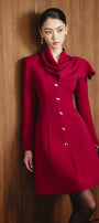 Special Features: Asymmetric draped scarf collar, Embellished faux jewel button row, Dart lines, Slit cuffs