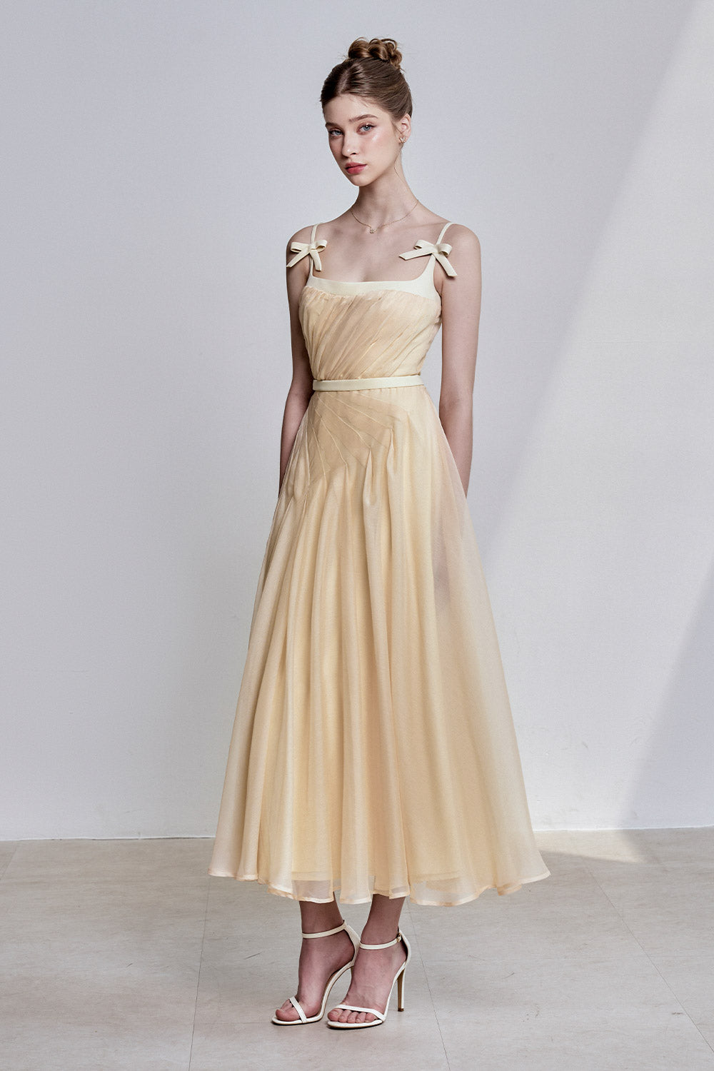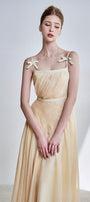 Special Features: Two petite satin bows adorn the straps, Diagonal pleats, Draped bottom
