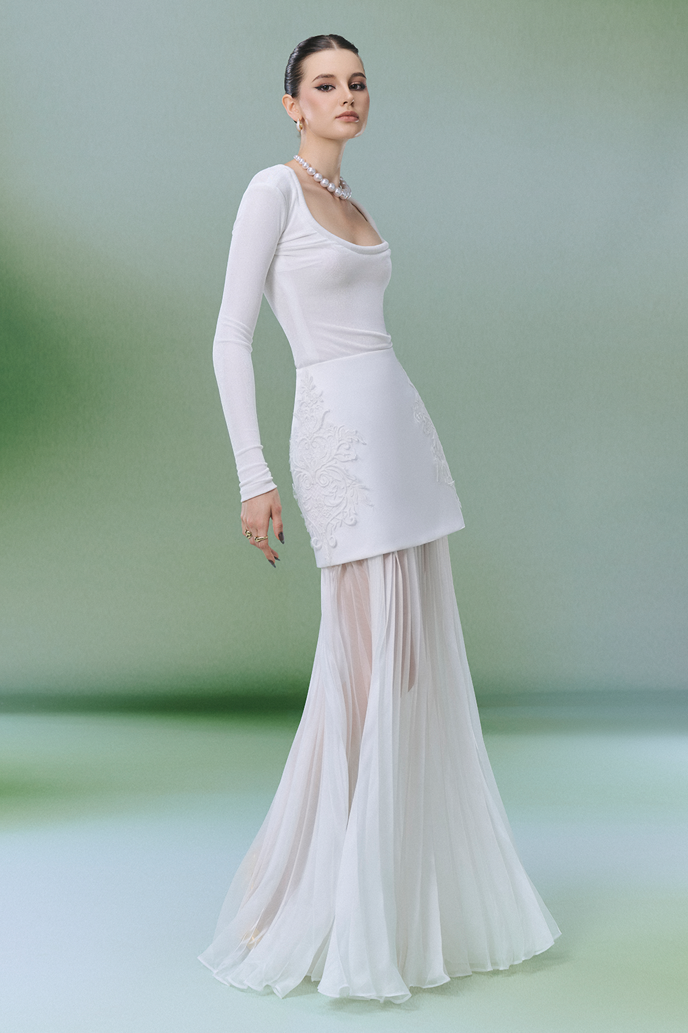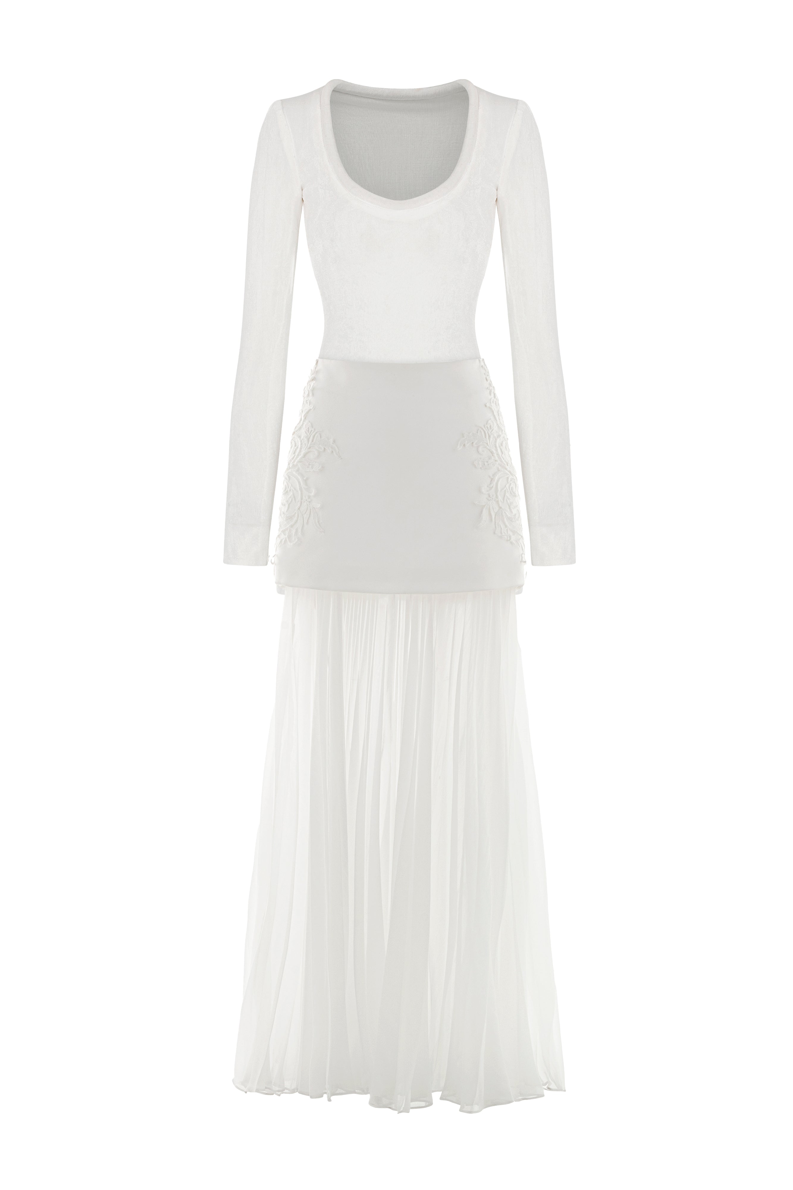 Expertly crafted, this sheath set features a modern square neck, regular sleeves, pleated detail, and exquisite embroidery. Premium spandex ensures a flattering, flexible fit. Perfect for formal events, cocktail parties, or elegant gatherings.