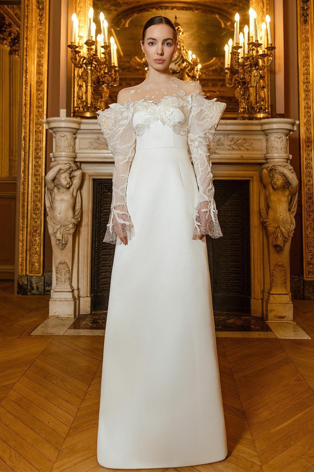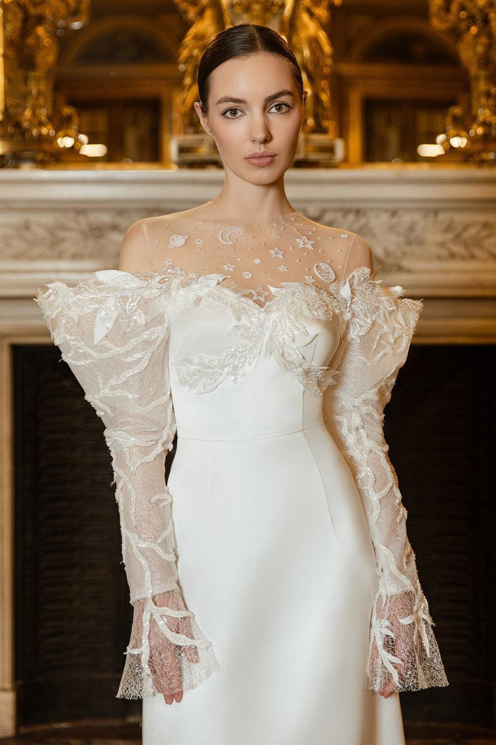 See-through neck design with stones, Sheer sleeves with leaf applique, Puffy sleeve hem