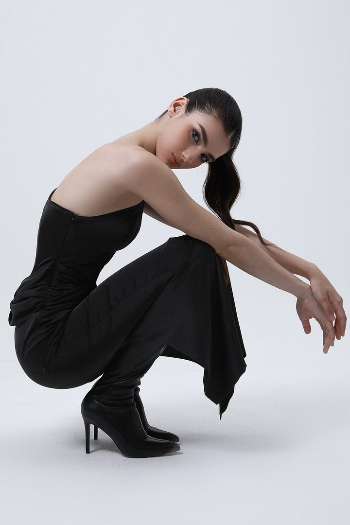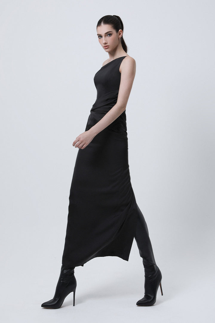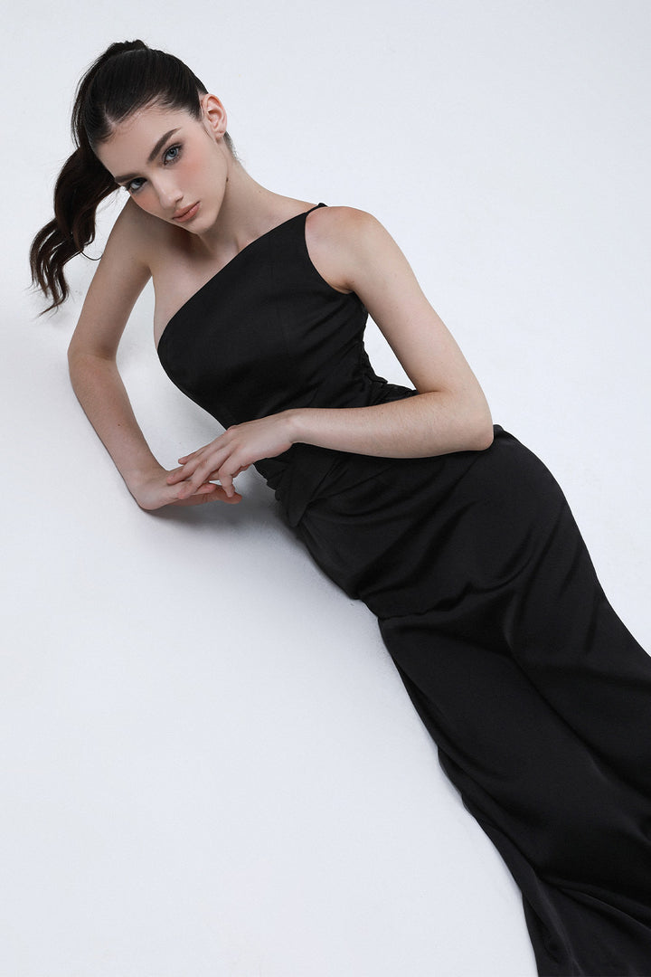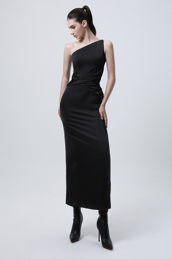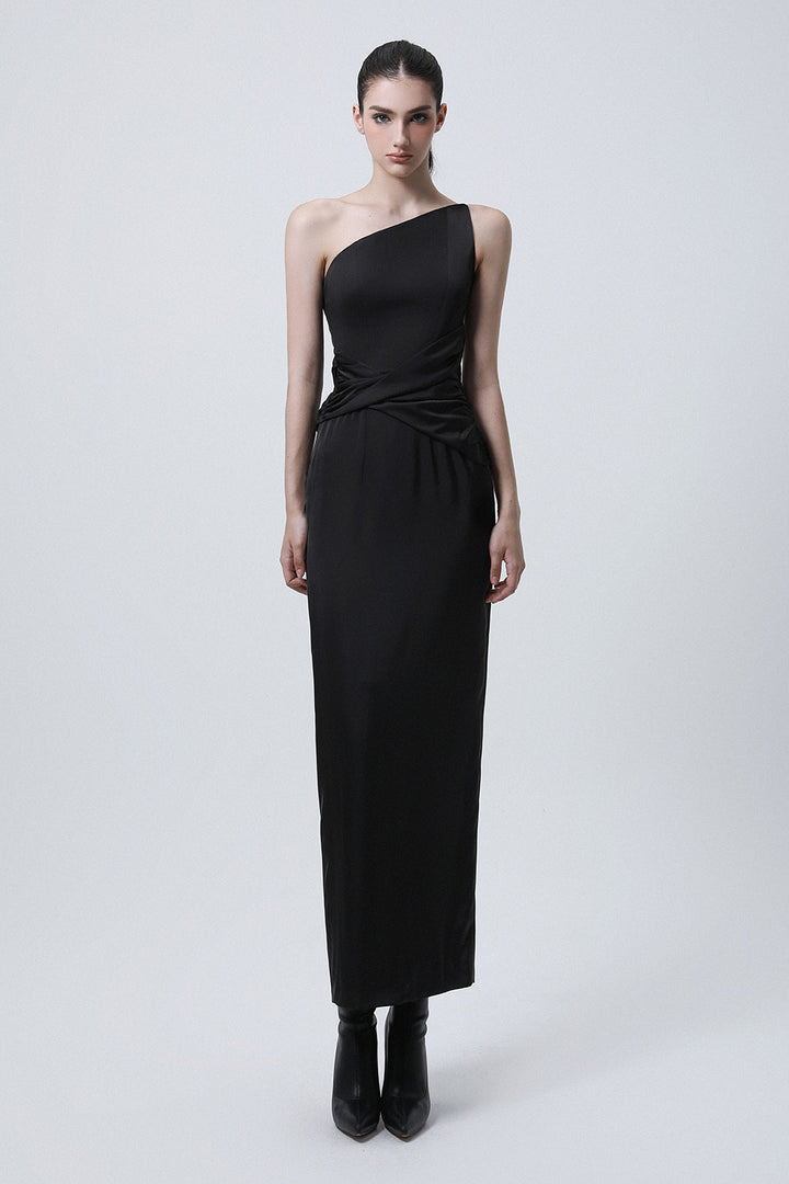 Expertly crafted from the finest silk, our dress will elevate your style to new heights. The one shoulder design adds a touch of sophistication, while the sheath silhouette highlights your curves. Perfect for any special occasion, this ankle length dress will ensure you make a lasting impression.