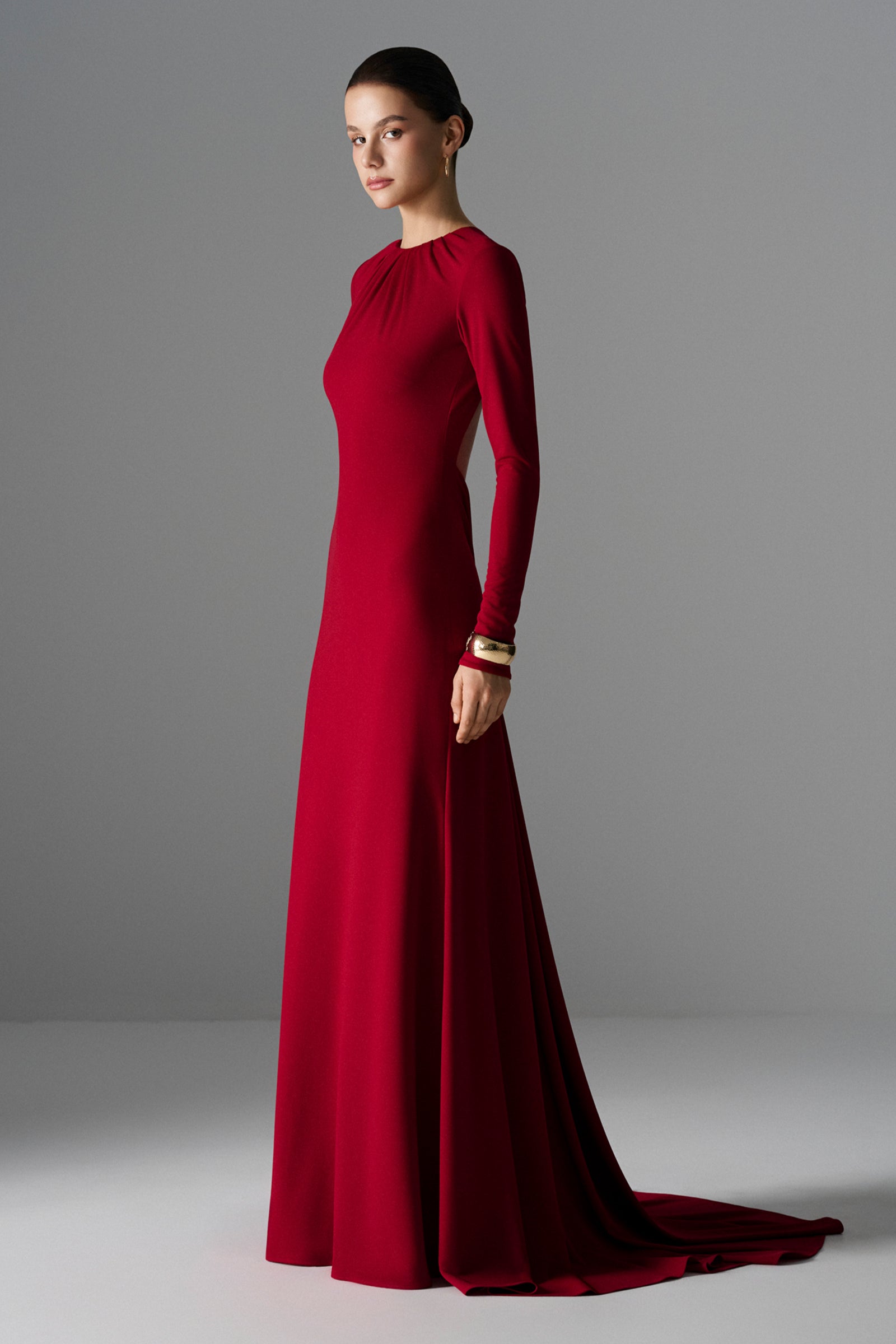 Experience refined sophistication in this sheath maxi dress, featuring a classic round neck, regular sleeves, and exquisite draped detailing. Expertly tailored for a sleek silhouette, this dress is perfect for evening events, cocktail parties, or formal gatherings.