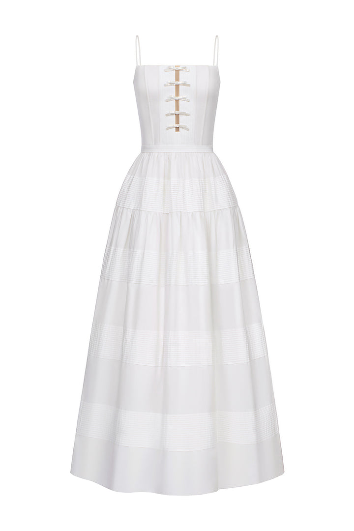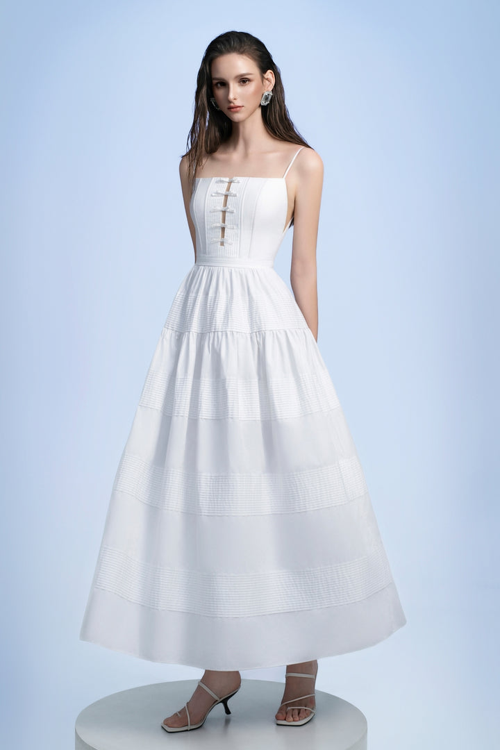 The dress features precise pintuck detailing that adds texture and visual interest to its classic A-line silhouette. Crafted from breathable cotton, this maxi dress ensures comfort and ease of movement while maintaining a structured, elegant shape. Ideal for warm-weather occasions, it combines expert design with timeless style for a polished yet relaxed look.
