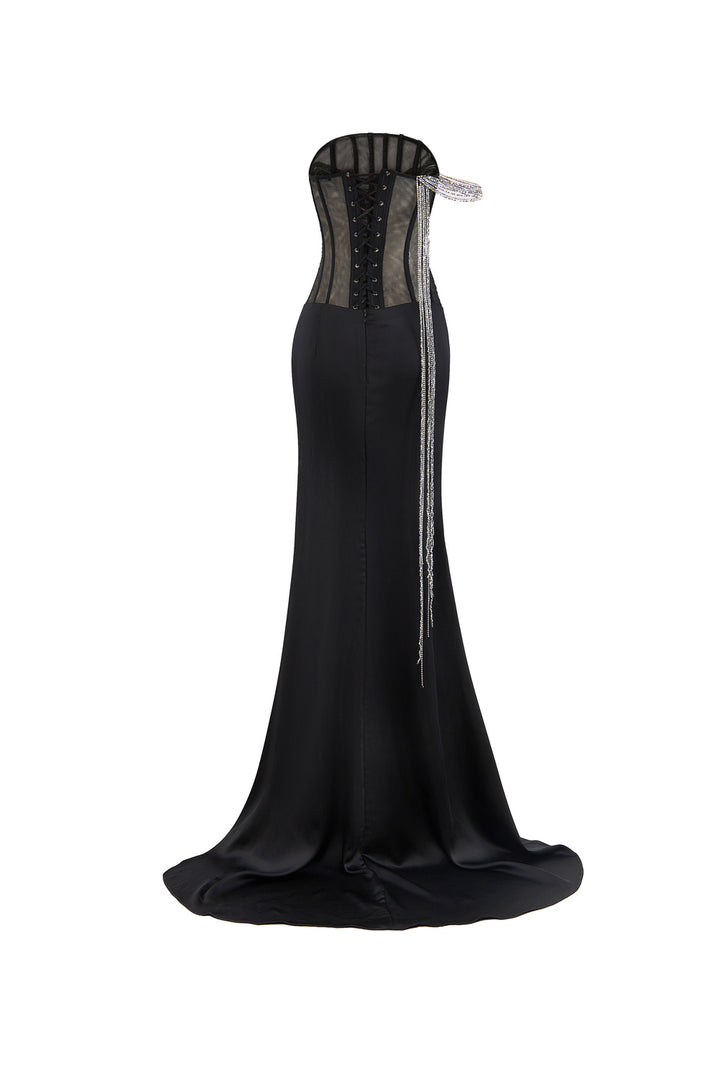 The dress features a structured corset waist that enhances your silhouette with elegant support. Its high slit adds a touch of daring sophistication, while delicate stone strings adorn the upper bodice, creating a refined sparkle. Crafted from luxurious mesh silk, this floor-length gown combines classic elegance with modern detailing for a standout evening look.