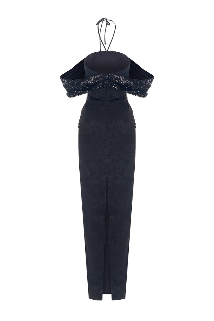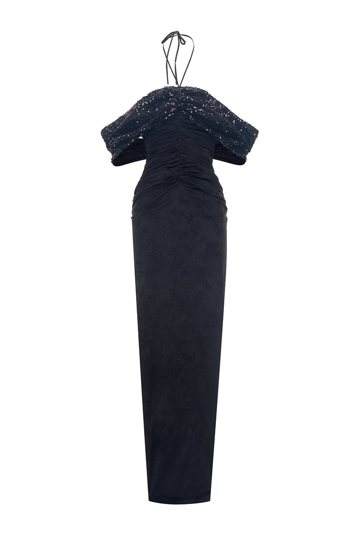 Expertly crafted with luxurious silk, the dress is a floor length sheath style dress that exudes elegance. The gathered detailing adds a touch of sophistication, making this dress a timeless and versatile piece for any formal occasion. Elevate your wardrobe with this stunning dress.