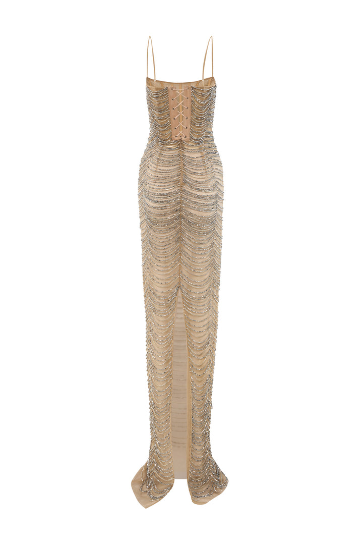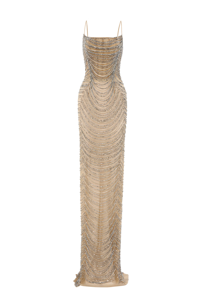 The bodycon dress offers a sleek, floor-length design with a mesh fabric that contours the body for a sophisticated silhouette. Featuring delicate spaghetti straps, it highlights the shoulders and neckline gracefully. An arc-shaped crystal embellishment adds an elegant focal point, enhancing the dress’s refined appeal for upscale events and evening wear.