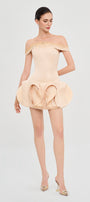 Expertly crafted in luxurious taffeta, this mini bubble dress features an off-shoulder neckline, elegant draped detailing, and tasteful bead embellishments. Ideal for cocktail parties, evening events, or special celebrations where you want to make a memorable fashion statement.