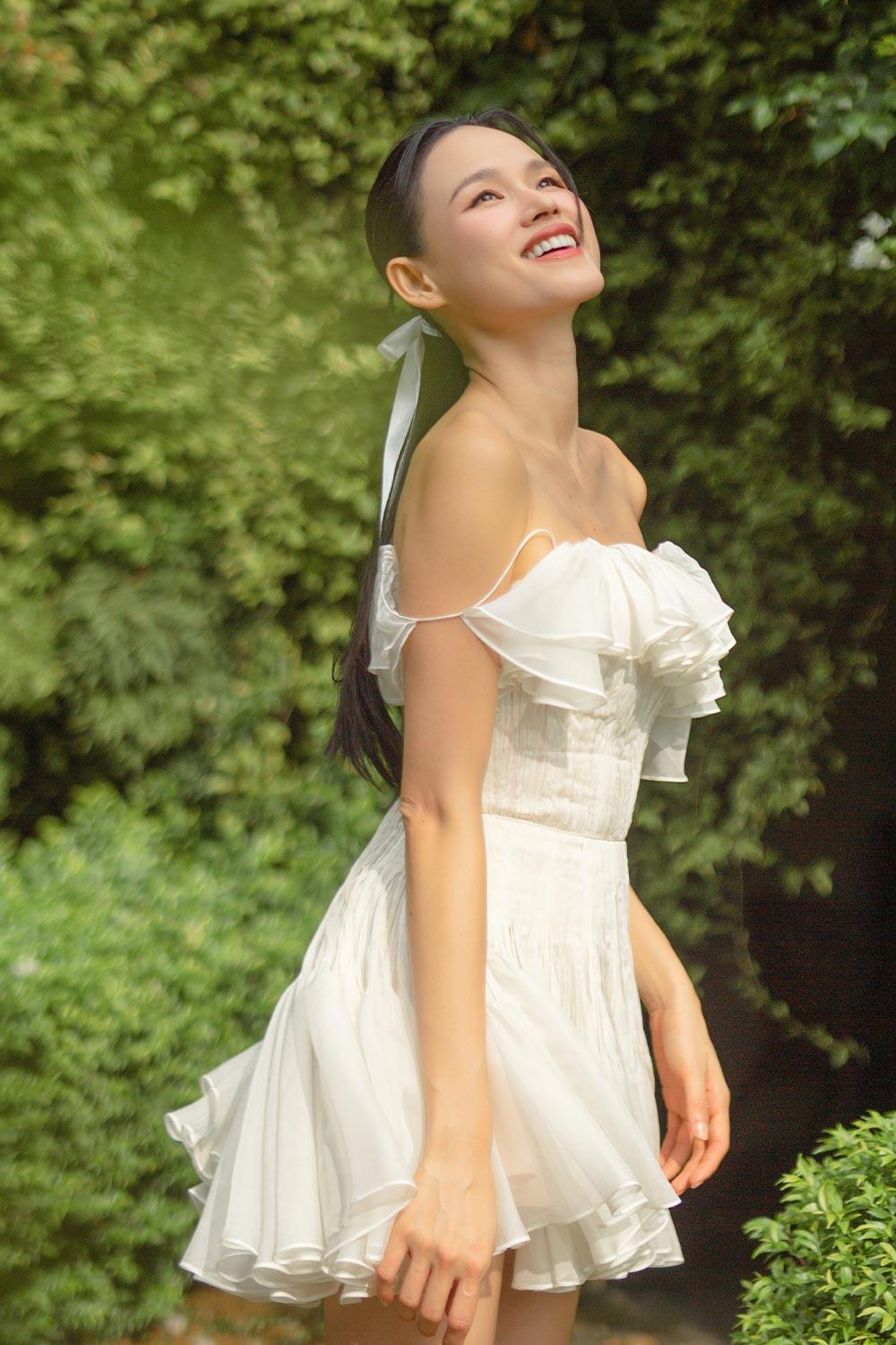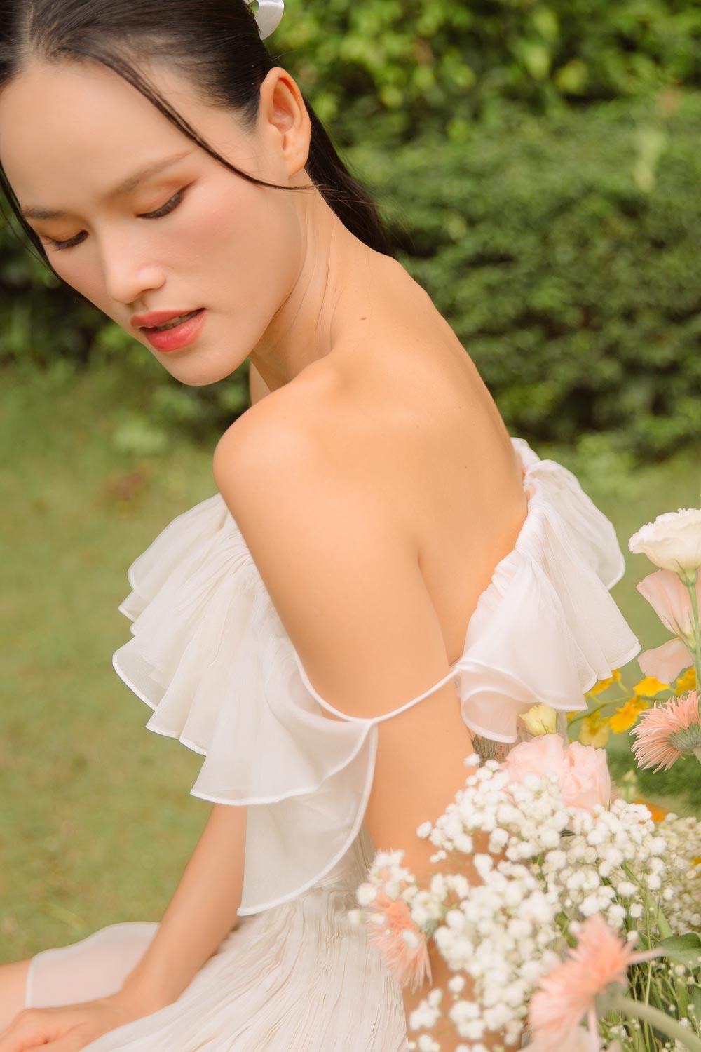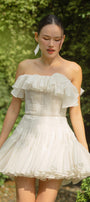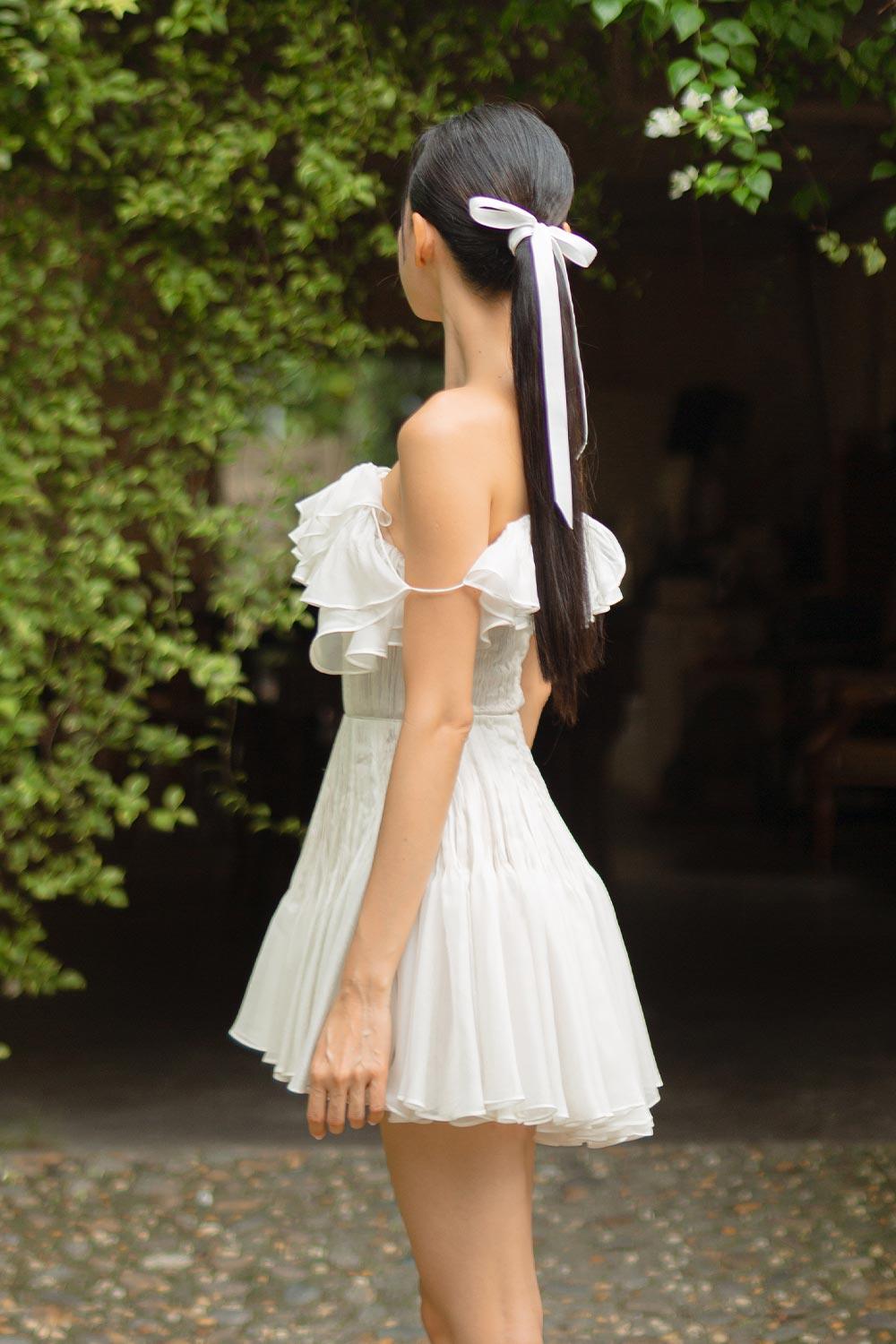 Ruffle trim along neckline, Waist pleated, Draped bottom, String connect at the arm