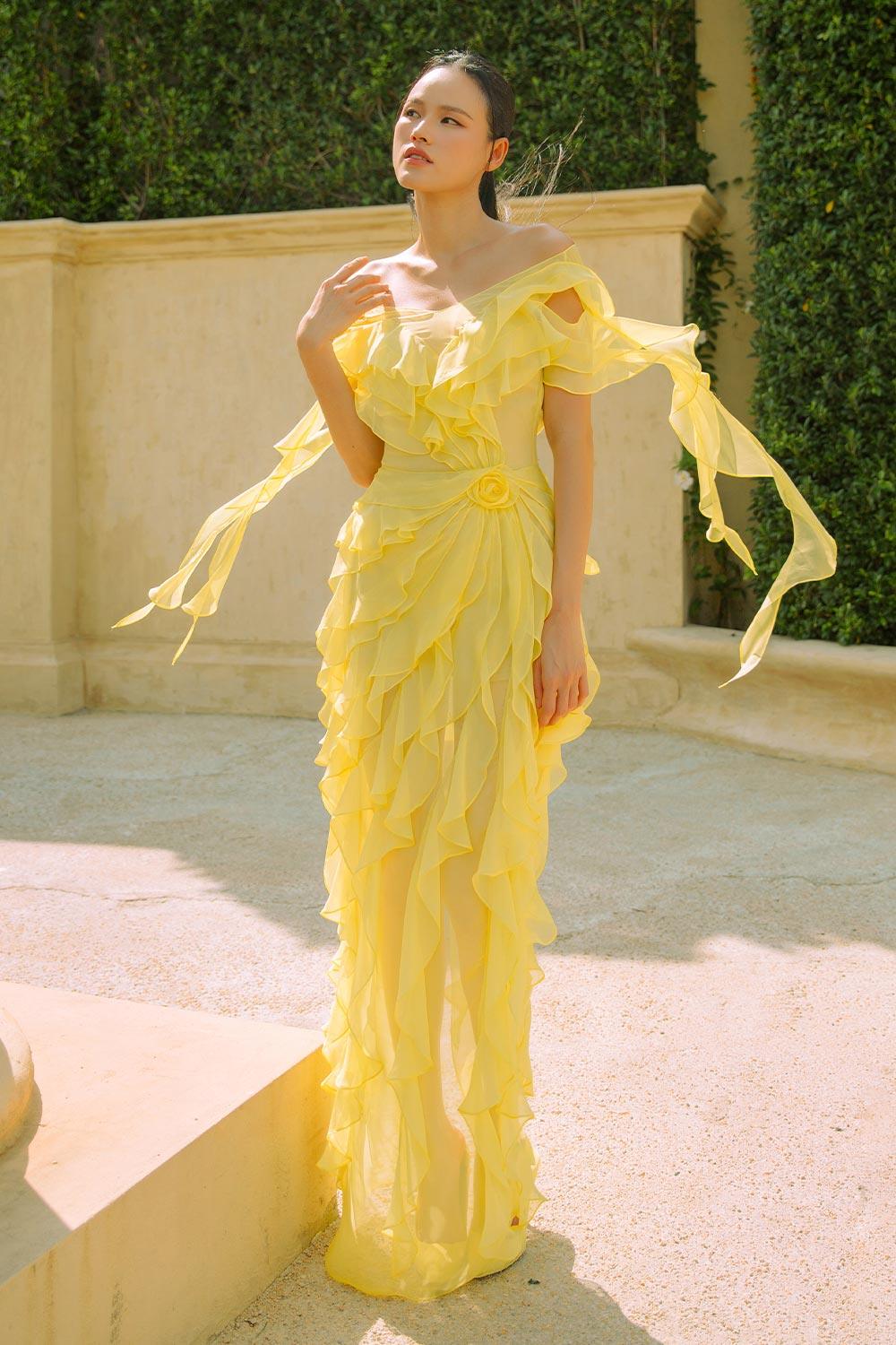 Ruffle layers entire the body, Back slit, Open back with horizontal bow tie