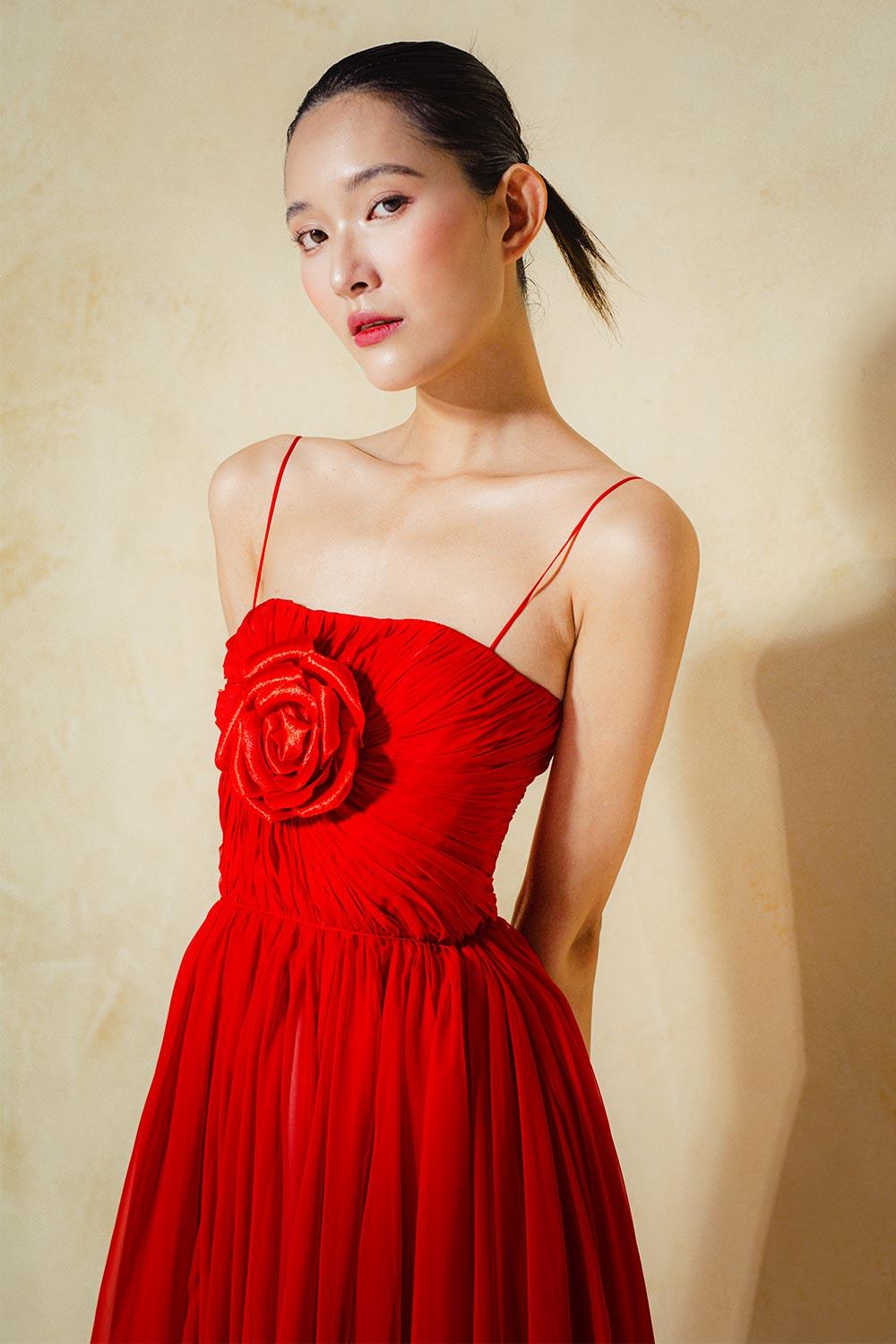 Twisted at the chest to create a rose, Draped bottom