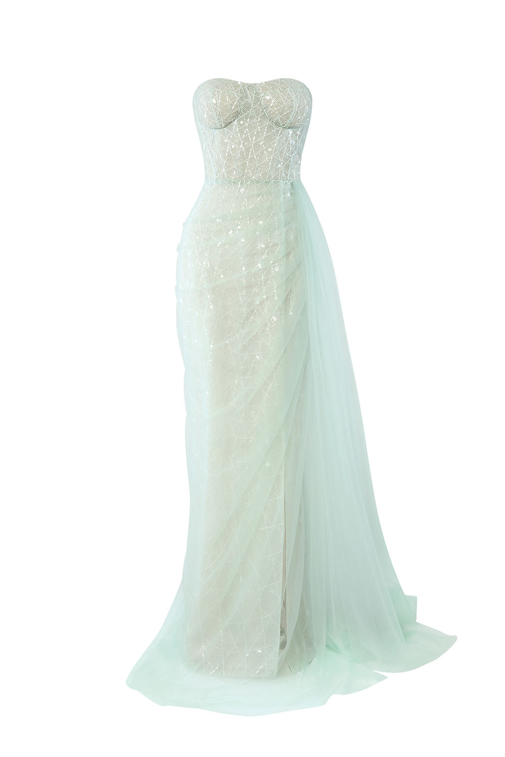 Special Features: Draped outer mesh layer with extra long flap, Detachable cape, Geometric pattern with sequin, Chest cup, Side slit